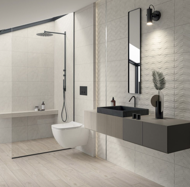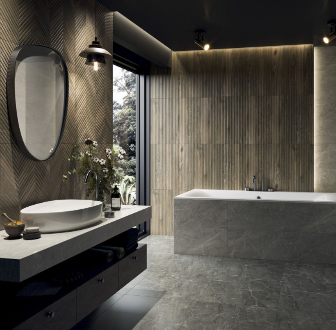 Оба варианта декоративных плиток коллекции Afternoon под дерево и под камень прекрасно сочетаются с базовыми плитками, имитирующими серый мрамор. Плитки для стен в коллекции Afternoon представлены в формате 29,8 x 59,8 см. Также коллекцию дополняет оригинальная ромбовидная мозаика в формате 20,6 x 23,7 см