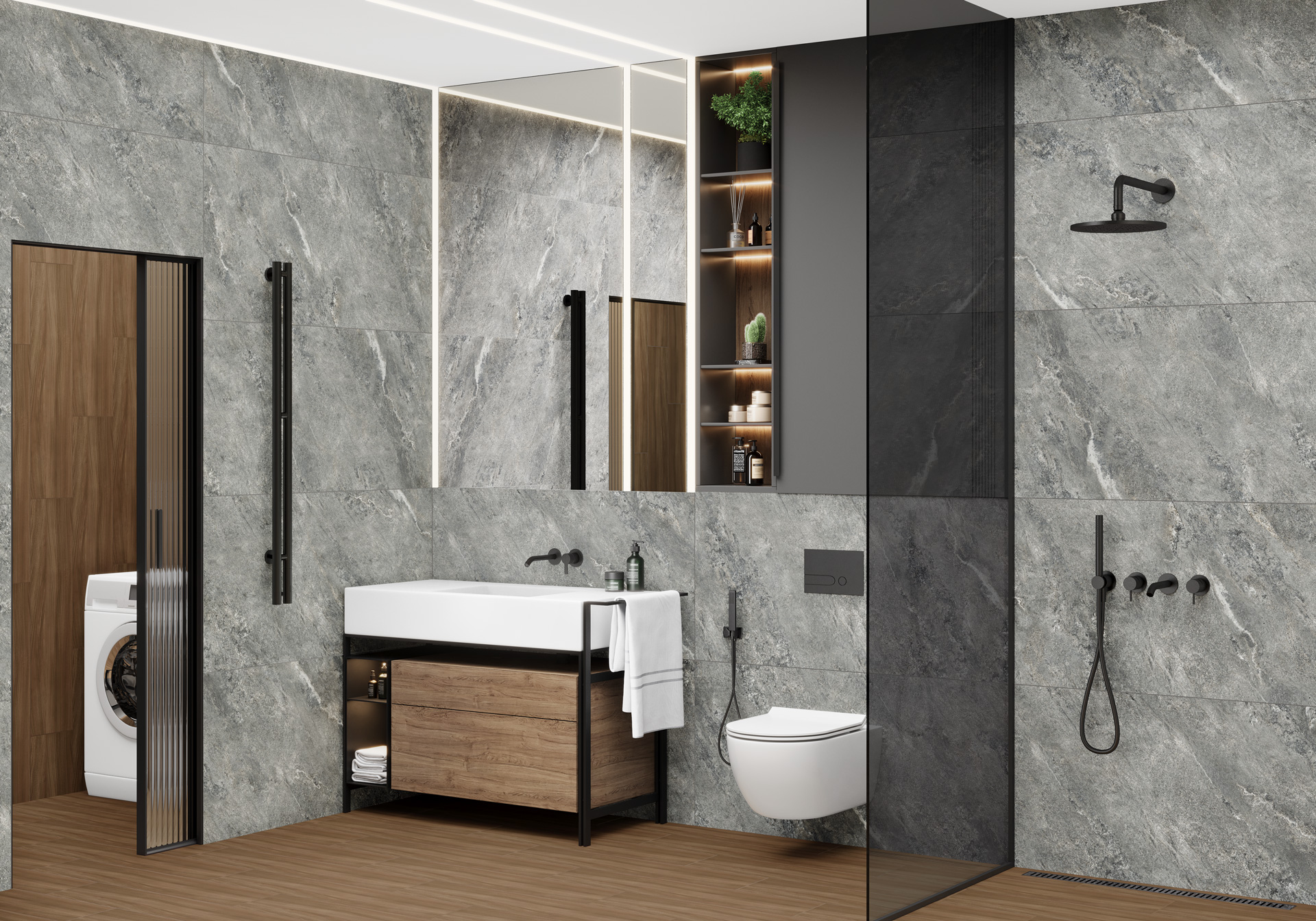 Матовая коллекция керамогранита Ajax в формате 600х1200 мм и 800x800 мм произведена в трёх классических серых оттенках. Текстура натурального камня примечательна своими направленными прожилками светлых и темных оттенков. Матовая бархатистая поверхность усилена спецэффектом карвинг по рисунку текстуры. Такой керамогранит подойдет для современного стиля интерьера в качестве основного фона, а также его можно сочетать с деревянными текстурами и акцентными мраморами, создавая зонирование пространства.