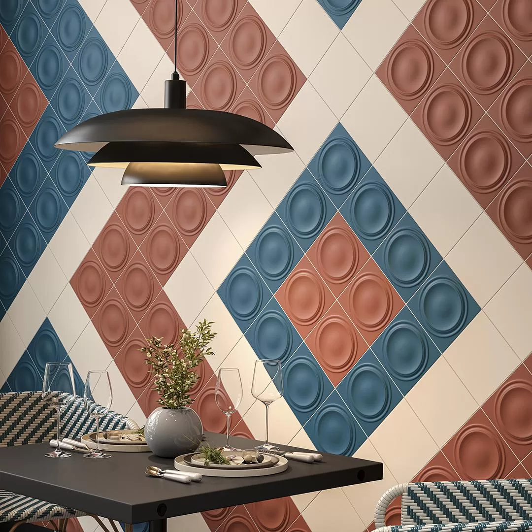 Первая структура напоминает круглый витраж или медальон, обычно размещаемый над входом в типичное венецианское жилище. Вторая очень похожа на корешки книг, стоящих на полке или лежащих аккуратной стопкой. Обе структуры представлены в пяти цветах, включая красную, синюю и зелёную плитку.