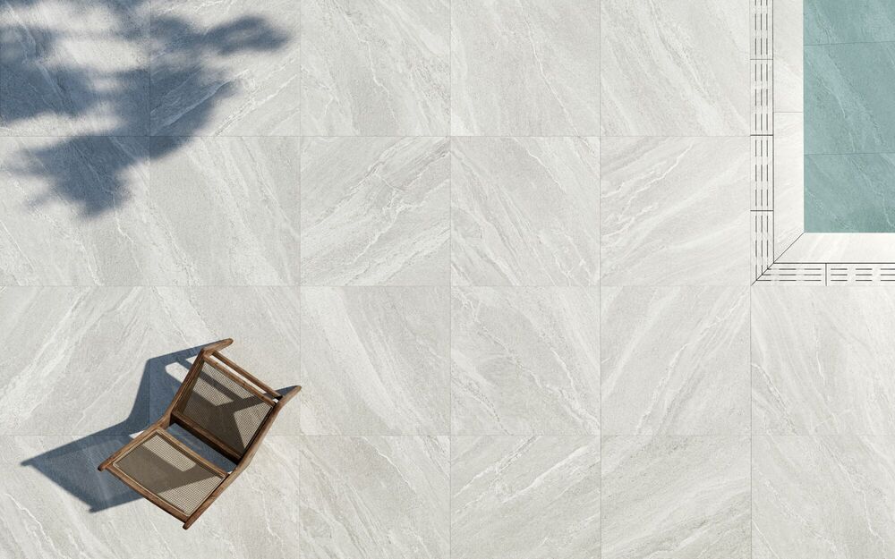 Модель, созвучная великолепному рисунку плитки Ocean Black с эффектом сланца, предстает в белом оттенке, излучая чарующее сияние и отличаясь истинной элегантностью. Воздушная структура делает этот материал подходящим вариантом для обширных пространств — как в помещениях, так и на открытом воздухе. Текстура с прожилками придаст любой композиции естественную изысканность.