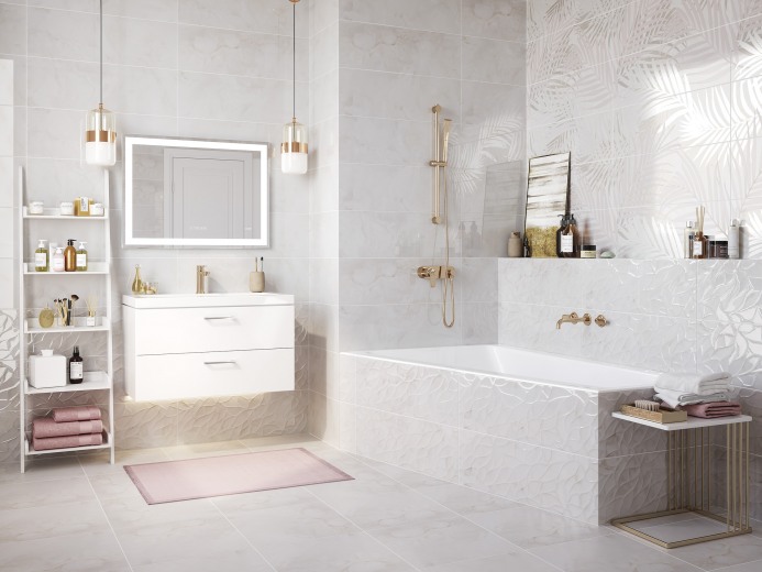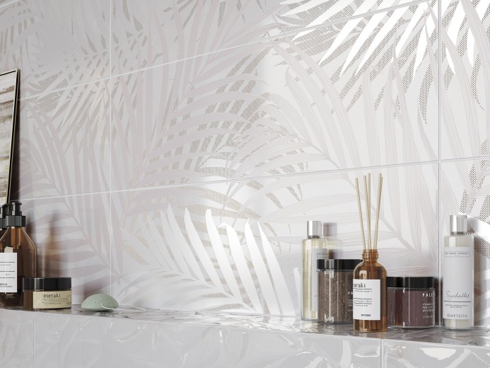 Керамическая плитка ASAI (АСАИ) в нежной бежевой гамме состоит из элементов, которые позволят создать несколько вариантов дизайна ванной комнаты. Панно с рисунком переплетающихся листьев пальмы Асаи определяет стиль пространства. Акварельный рисунок облицовочной плитки в бежевом цвете, станет достойным обрамлением главного элемента коллекции. С помощью декоративных бордюров - розового стеклянного или металлического золотого можно подчеркнуть панно и визуально разделить функциональные зоны. Напольная плитка в бежевом цвете поддерживает общий стиль интерьера.