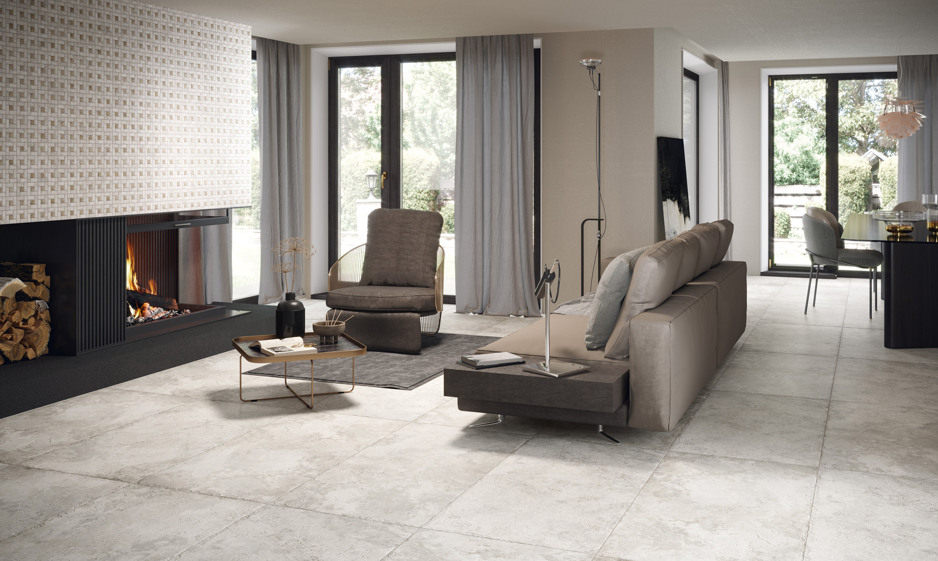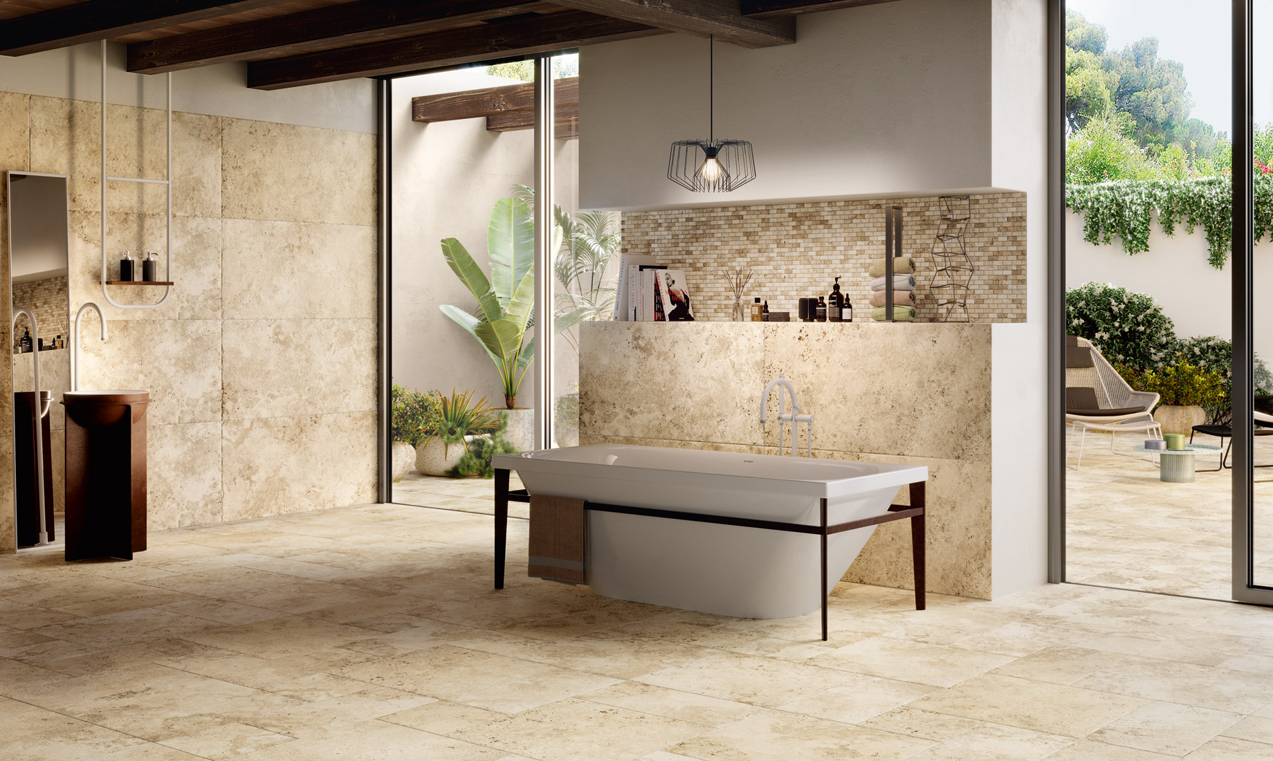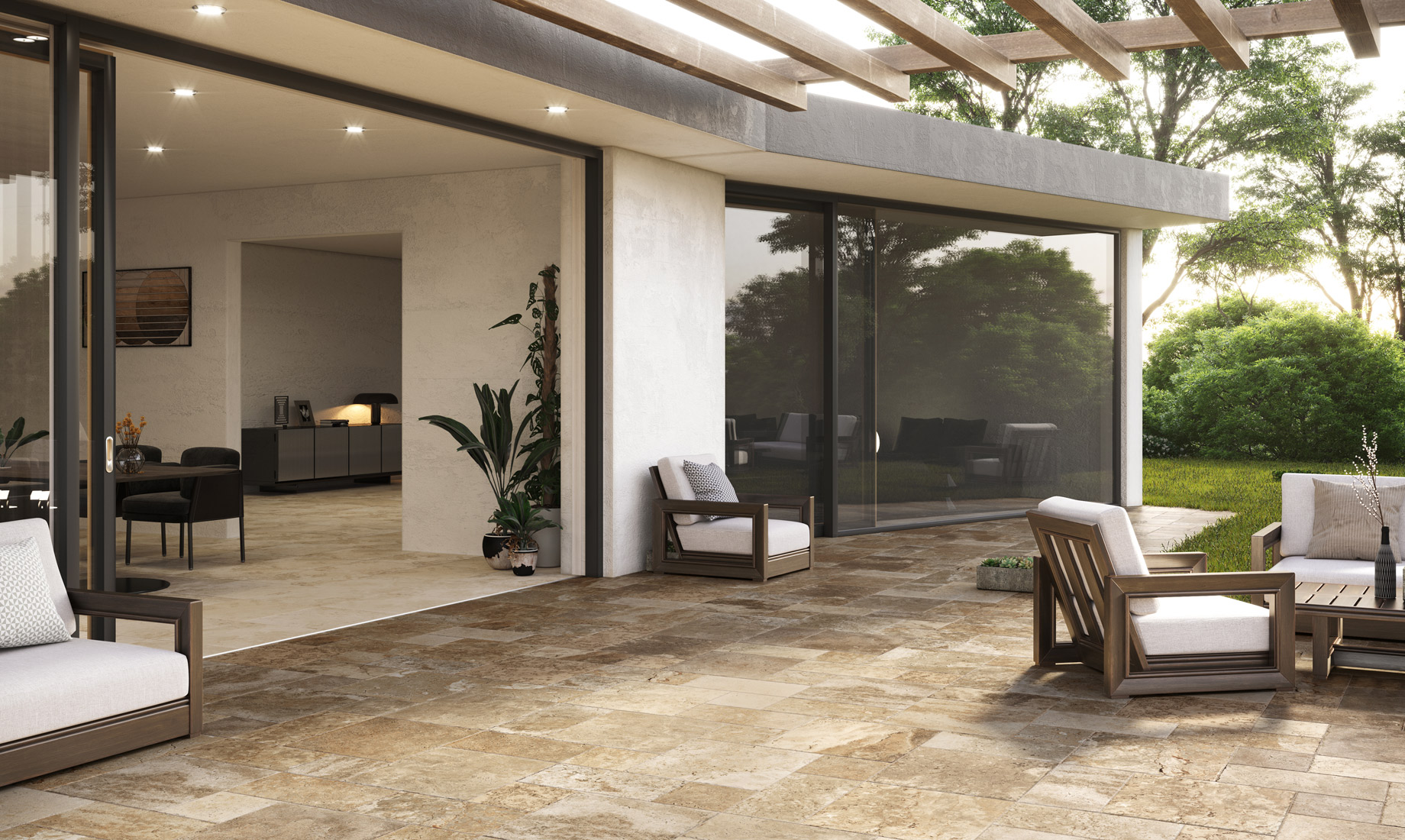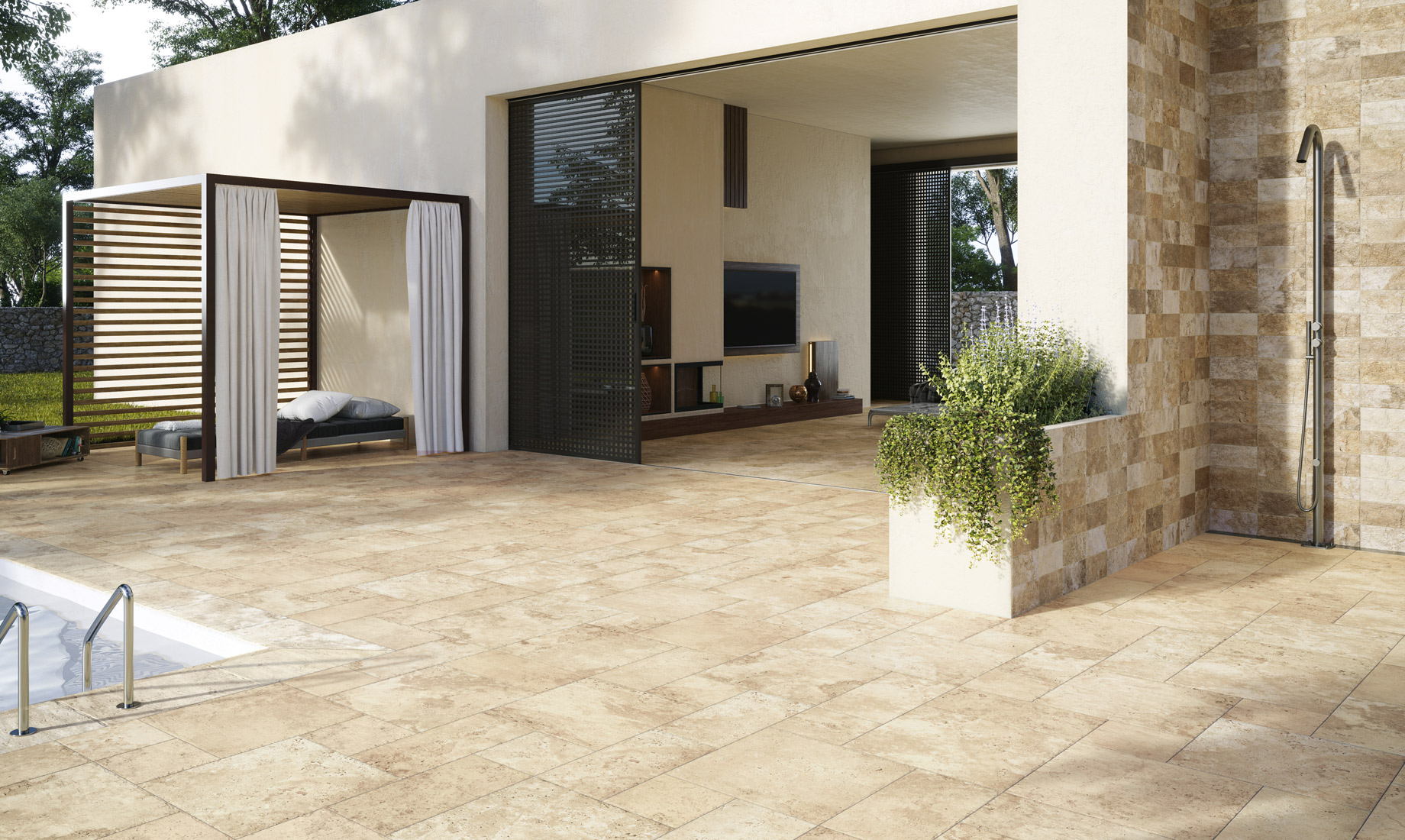 Сокровенная связь архитектуры, технологии и природы. В коллекции Aurum керамогранит имитирует красоту травертина его с типичными разводами, которые видны на этом материале при поперечной резке.