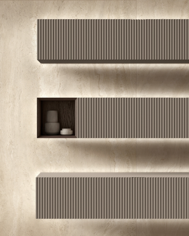 Травертин, известняк и мрамор воплощают в себе превосходство традиционного сырья, отвечая эстетическим требованиям современности. Архитектурное пространство обогащается элементами, которые заполняют пространство, не доминируя над ним, усиливая его изысканный характер.