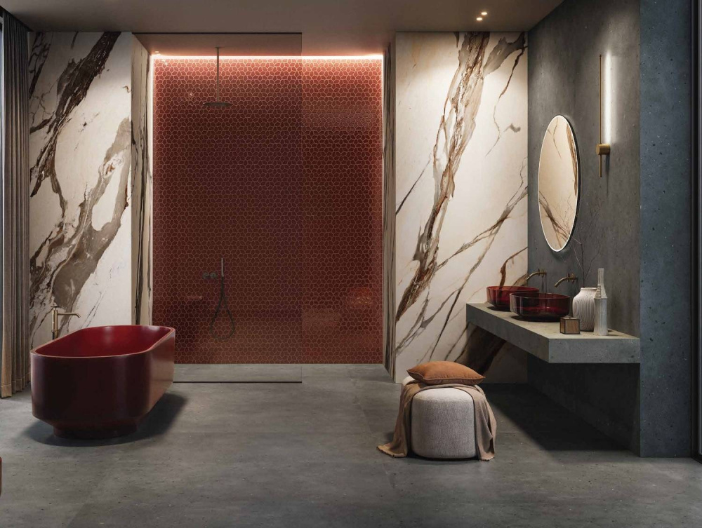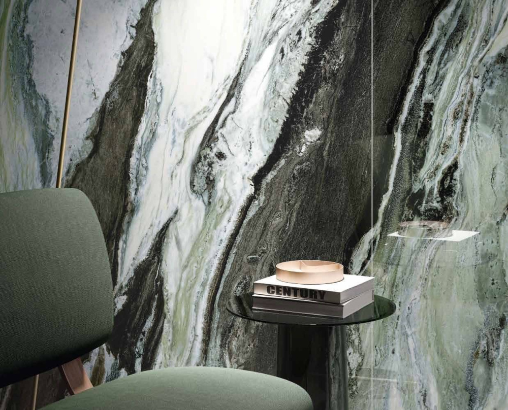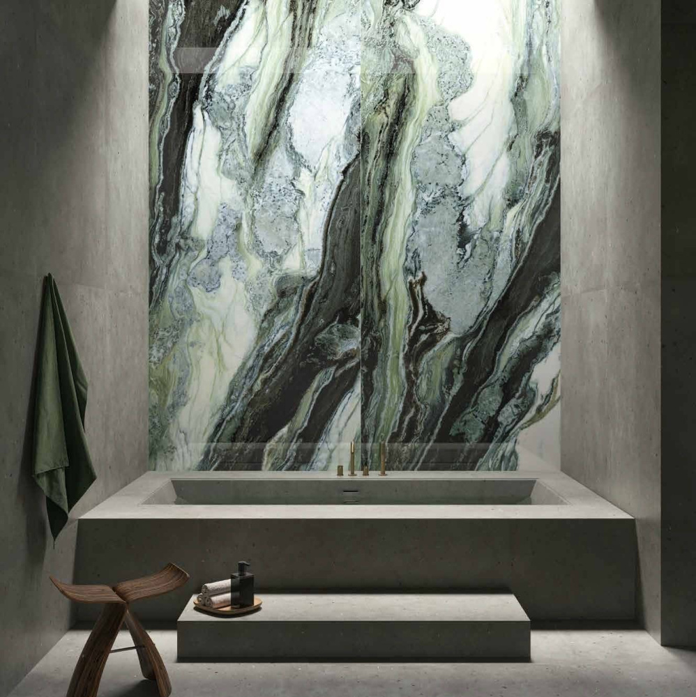 Помимо традиционных размеров, коллекция предлагает впечатляющий макси-формат 120×278 см в трех бетонных (Пьюр, Сильвер, Блэк) и двух мраморных вариациях (Эксклюзив Грин, Калакатта Ворм). Сокращение количества швов усиливает визуальное воздействие материала в интерьере, создавая ощущение монолитности и простора.
