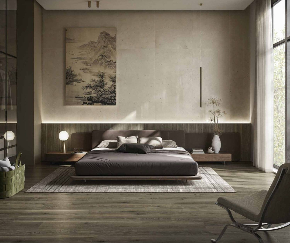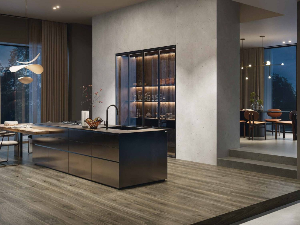 Особое тепло и уют пространству придают два оттенка керамогранита с эффектом дерева, формирующие интересный контраст с холодными бетонными поверхностями. Деликатные древесные текстуры перекликаются с тональностью вкраплений, сохраняя при этом минималистичную природу основного материала.