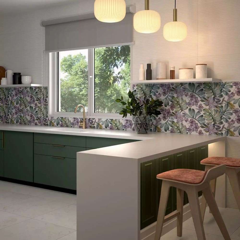 При создании серии мы вдохновлялись парком Бела-Виста: расположенные недалеко от центра Лиссабона открытые зелёные пространства не раз становились местом проведения крупных музыкальных событий и опенэйров, а когда здесь нет мероприятий, горожане гуляют по дорожкам, изгибы которых подчёркнуты светлым камнем, и наслаждаются цветением кустарников. Любители комнатных растений серии Бѐла-Вѝста узнают в декоре плитки с цветами листья монстеры и венчики орхидей. Такое украшение из плитки на фартуке в кухне, на плитке в ванной комнате или даже в гостиной будет прекрасно сочетаться с растениями в интерьере, привнося в современную обстановку очарование тропиков. Разноцветная плитка идеально подойдет для фрагментарной отделки. Горизонтальная полоса из листьев и соцветий в сочетании с однотонной плиткой-компаньоном превратит стандартное помещение в прекрасный оазис. Керамическую плитку с цветами 30×89,5 см дополняет широкий бордюр с таким же рисунком, расширяя возможности оформления пространств. К примеру, нарядная цветочная полоса в ванной комнате может, как бы огибая, подчеркнуть мебель или сантехнику. Нарядная отделка идеально подойдёт в качестве плитки на фартук. Стандартное расстояние между столешницей и нижним краем навесных шкафов составляет 45 — 47 см, комфортную для расположения плитки и бордюра. В качестве компаньонов серия предлагает керамическую плитку светло-молочного оттенка гладкую и в тонкую неброскую полоску. Два варианта тонких бордюров позволят аккуратно оформить линию края. Разноцветная плитка из серии Бѐла-Вѝста будет также хорошо сочетаться с голубоватыми, оливковыми, болотными, салатовыми, охристыми, коричневыми оттенками.