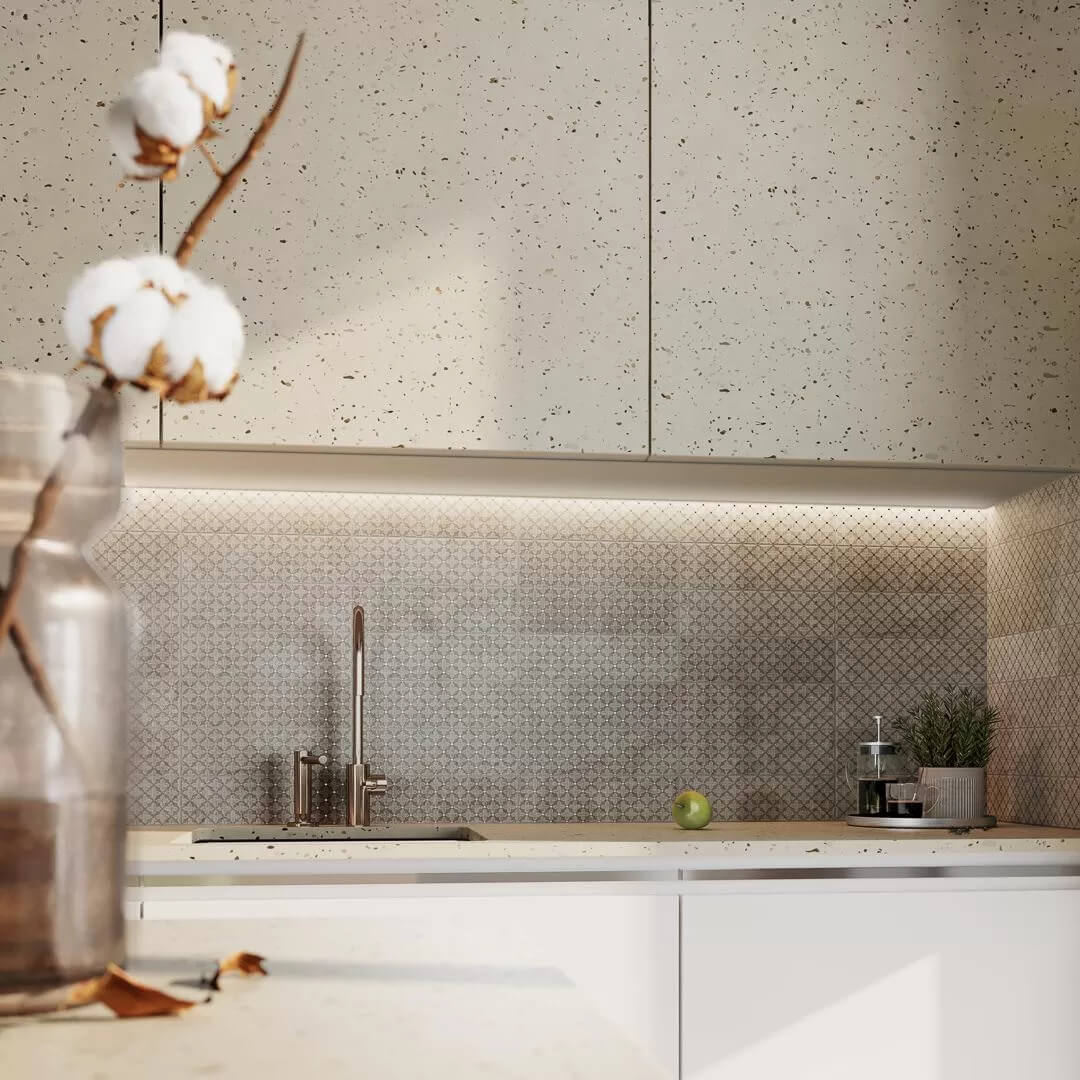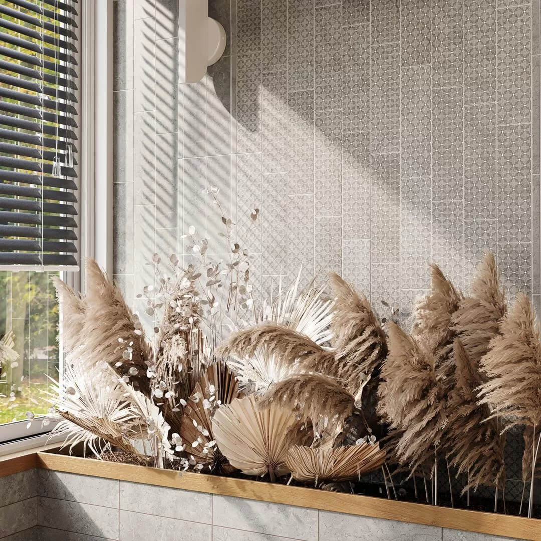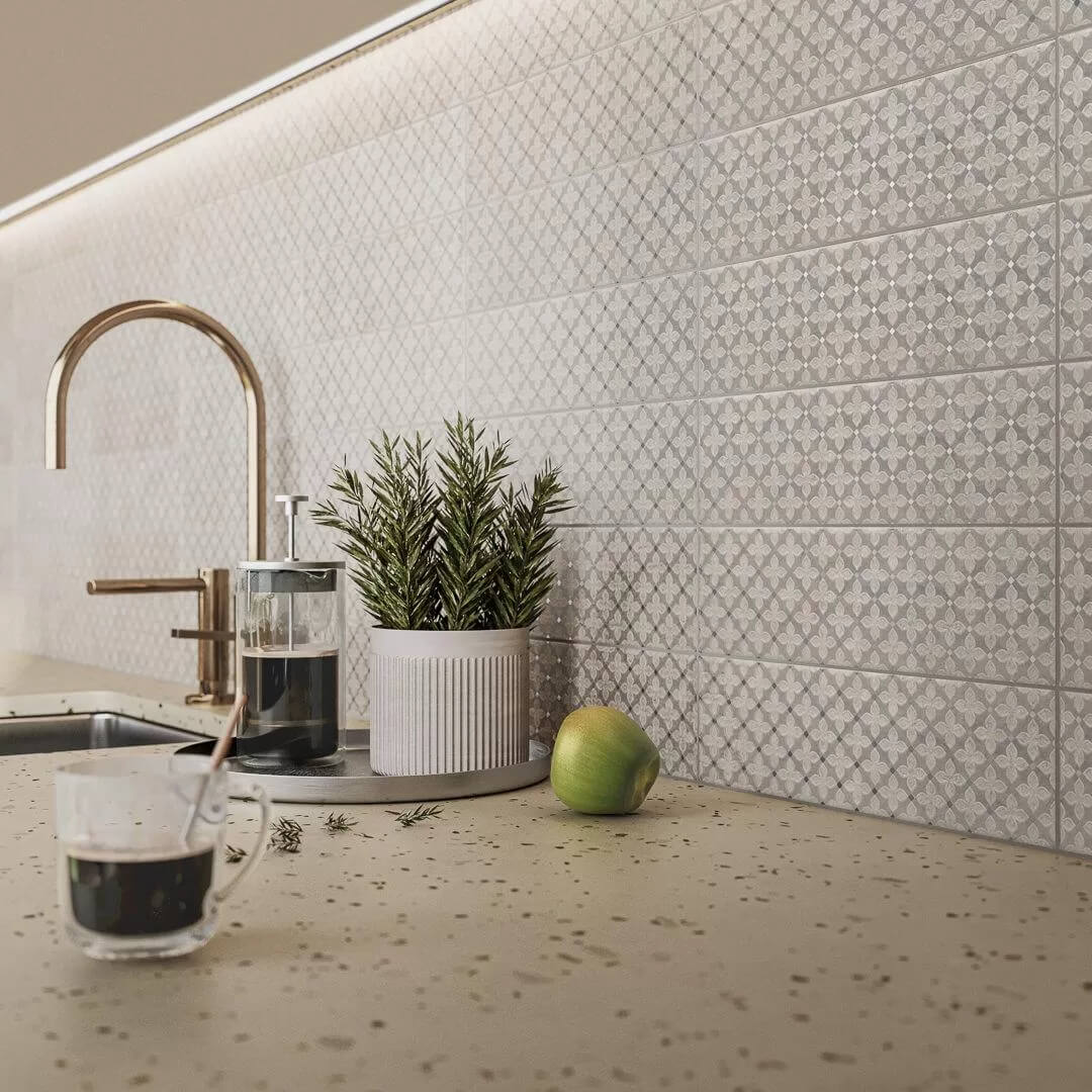 Серия декоративной плитки Борго от фабрики КЕРАМА МАРАЦЦИ может выступать в роли основного отделочного материала или сочетаться с базовой керамикой. На орнаменте изображен классический четырёхлистник. Благодаря используемому металлизированному составу узор имеет характерный блеск. Дизайнеры предлагают разнообразить раскладку изящным кантом из гладких и структурированных бордюров-карандашей. Используя раскладку шеврон, можно подчеркнуть особую динамику, свежесть и красоту интерьера.