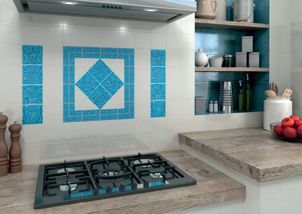 Коллекция керамического покрытия Керама Марацци Букет состоит из однотонной напольной и настенной плитки белого цвета, однотонной напольной плитке голубого и бирюзового цвета, керамического панно, керамического бордюра и керамического декора яркого голубого цвета, на основу которого нанесено красивое изображение летних цветов.