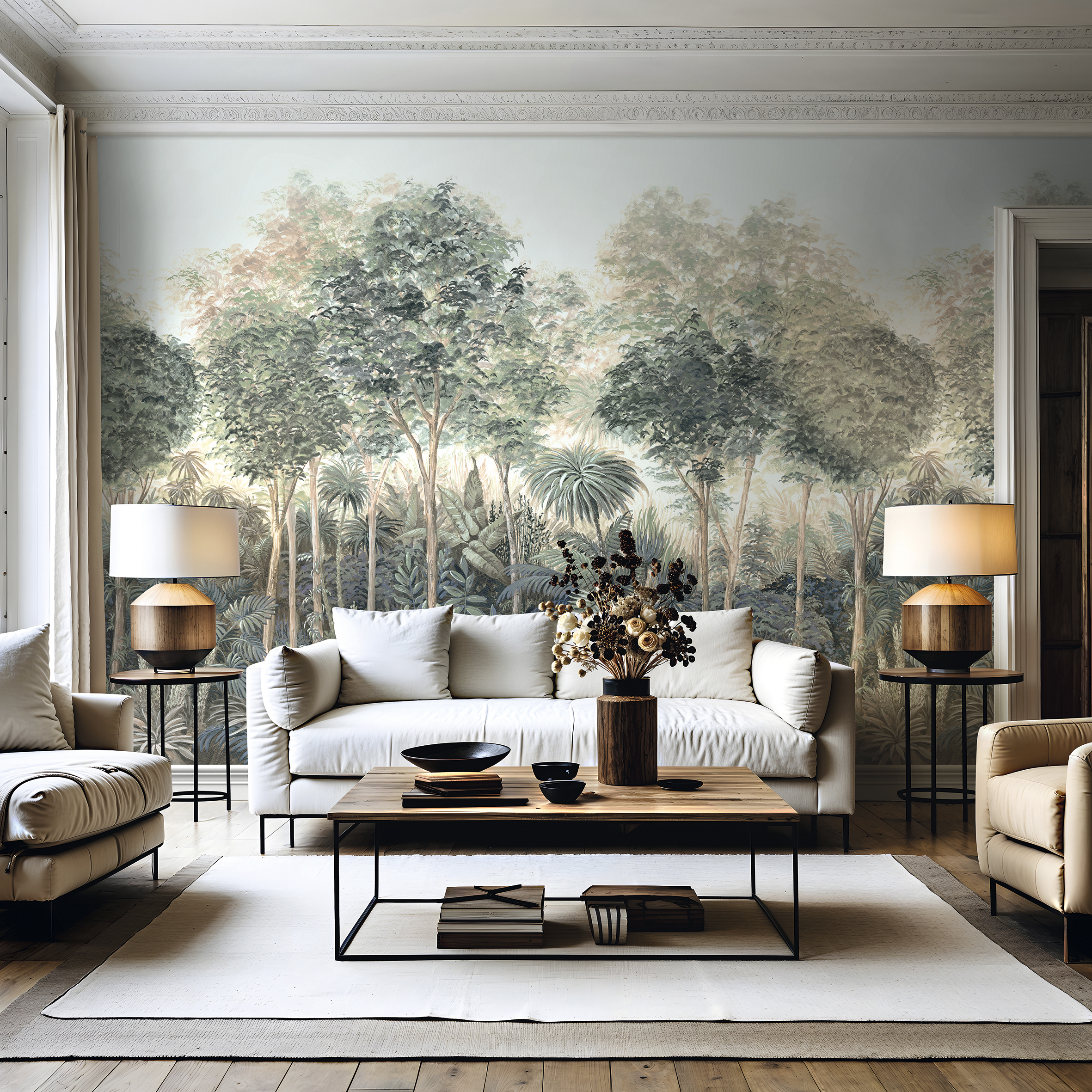 Особое место в коллекции занимают панно. Одно из них — как живописный этюд: растительный мотив будто вписан кистью художника прямо в стену. Он расширяет пространство, наполняет его дыханием природы и спокойствием прогулки по весеннему саду. Другое — более графичное, с элементами ар-деко. Это природа, пропущенная сквозь ритм и стиль, добавляющая интерьеру структуру, глубину и лёгкий налёт богемной элегантности.