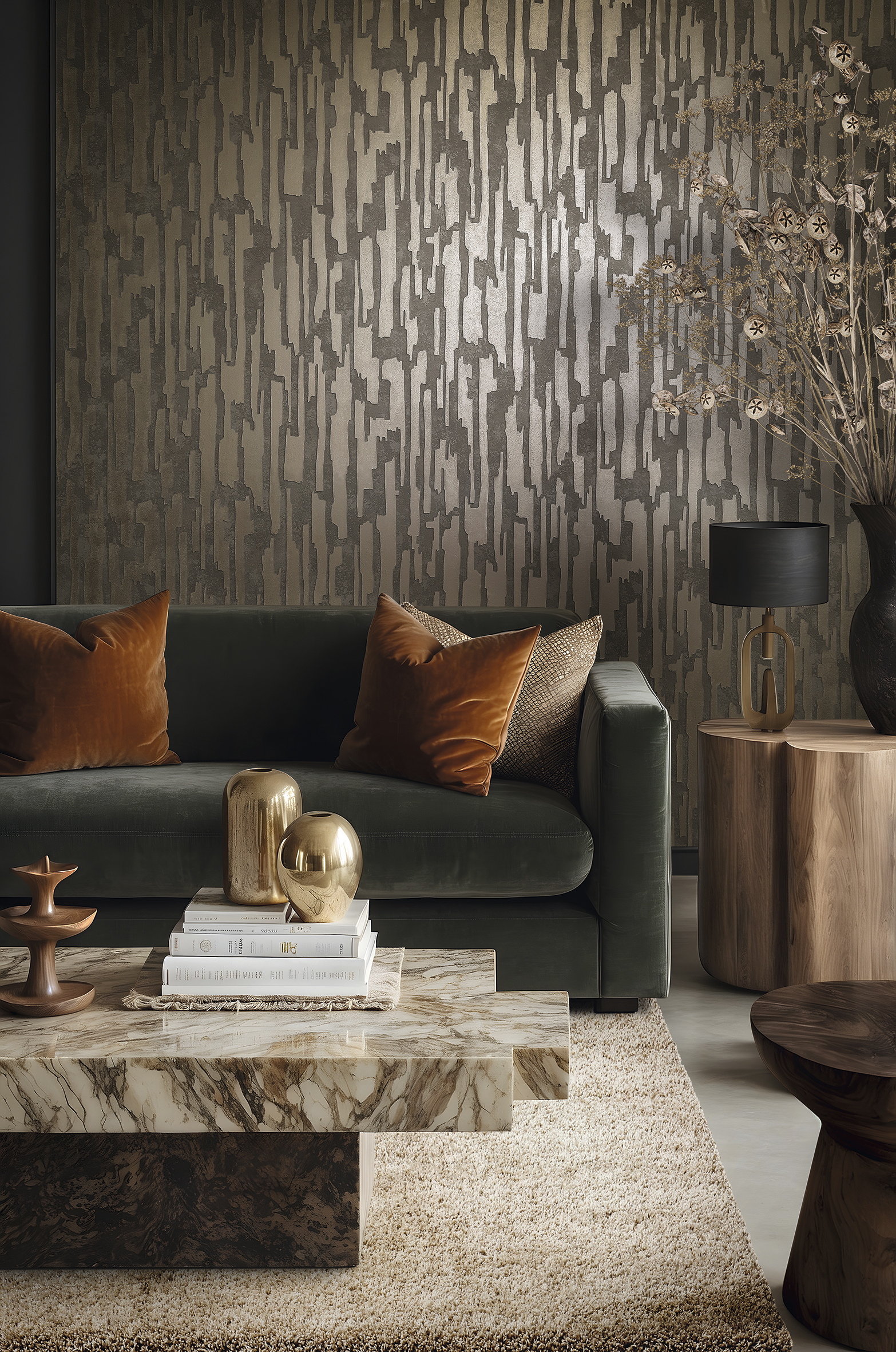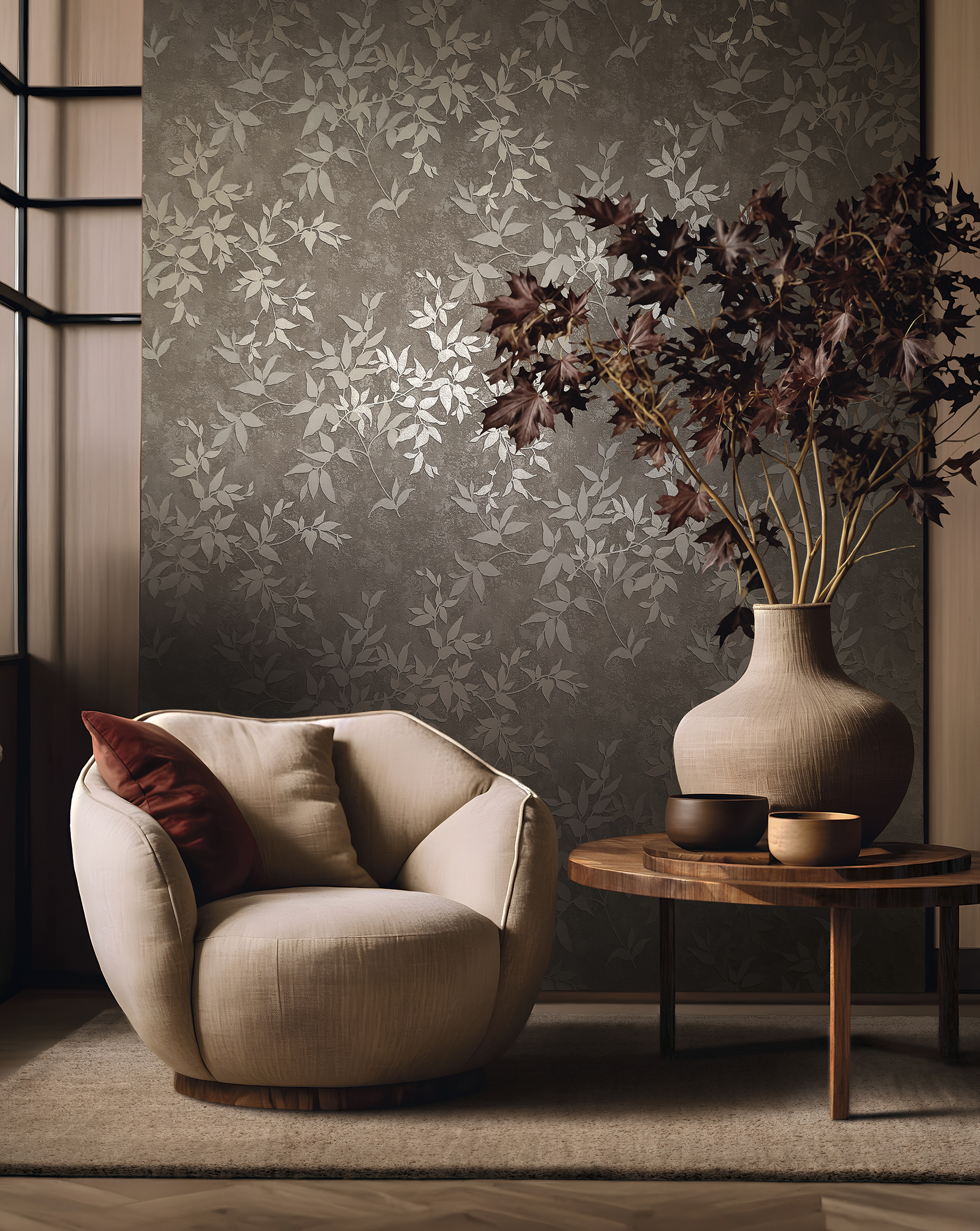 Каждый дизайн коллекции — словно дыхание природы, вплетённое в текстуру стены. Здесь можно найти тончайшую листву, едва уловимо мерцающую на фоне, будто состаренном временем и солнцем. Эта патинированная глубина не перегружает, а наоборот — создаёт ощущение покоя и благородства.