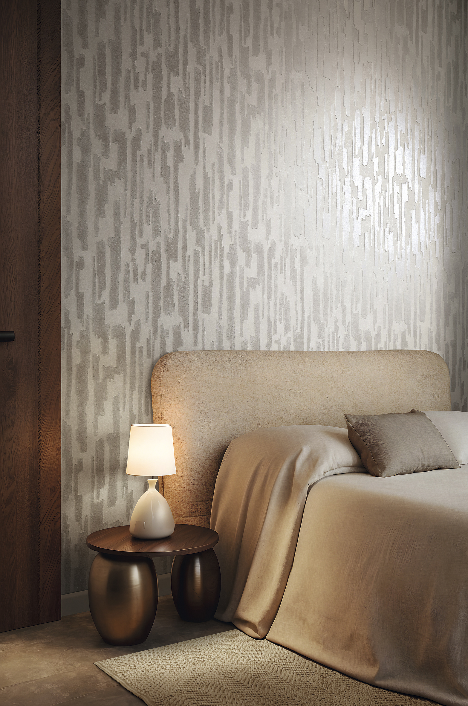 Есть поверхности, напоминающие выветренный камень — тактильные и сдержанно мощные. Они вносят в интерьер современную силу, уверенную, но не кричащую. Здесь же — текстуры, как облупившаяся краска, за которой будто бы просачивается свет. Эти мерцания — как воспоминания, нежные и завораживающие.