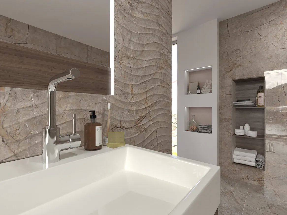 Crema Cappuccino имитирует один из камней, традиционно добываемых и используемых при строительстве в юго-западной Азии. Это идеальный вариант для пространств, которые стремятся выделиться за счет изысканных поверхностей. Бронзовый оттенок, интенсивность рисунка на поверхности, «высокий» глянец делает эту коллекцию характерной и придаст роскошный вид любому интерьеру. Наличие различных рельефных поверхностей на изделиях коллекции, позволит сделать пространство более индивидуальным и энергичным.