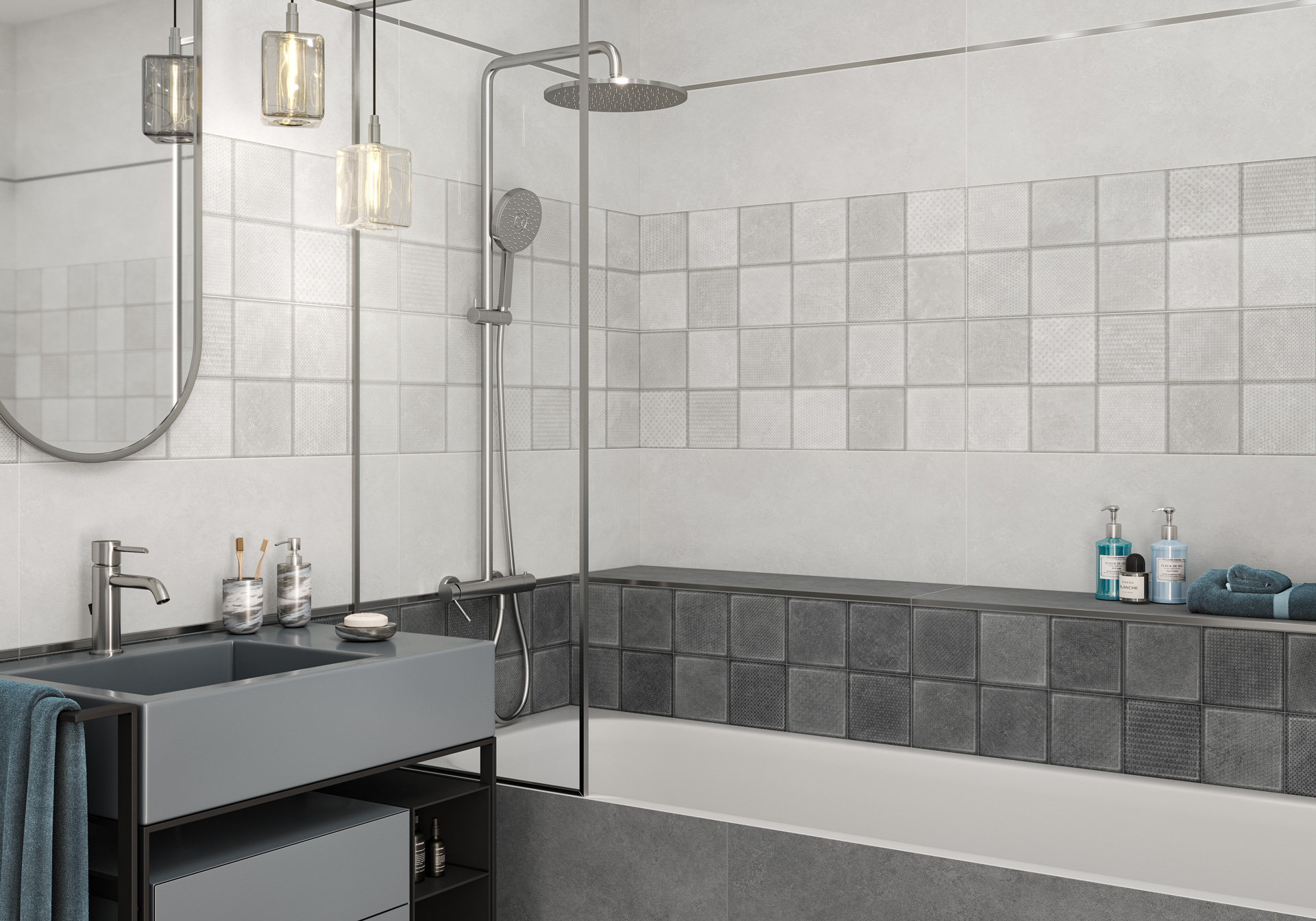 Коллекция настенной плитки Cube произведена в формате 300x900 мм, в серой цветовой гамме. Два цвета базовых плиток дополняются декоративными массивами в виде монохромного пэчворка с элементами принтов с имитацией шва. Спокойный, но вместе с тем запоминающийся дизайн будет уместен в таких дизайнерских стилях, как минимализм, нео-мемфис, лофт и контемпорари. Все плитки коллекции произведены в матовой поверхности. Такой дизайн можно применить как в домашнем интерьере, так и в общественных пространствах. Плитка имеет ректифицированный край, он является дополнительным преимуществом, позволяющим осуществить укладку с минимальным швом. В состав коллекции входит платиновый бордюр и напольный компаньон в виде керамогранита с текстурой бетона в формате 600x600 мм, также предлагается керамогранит с текстурой дерева в формате 200х900 мм.