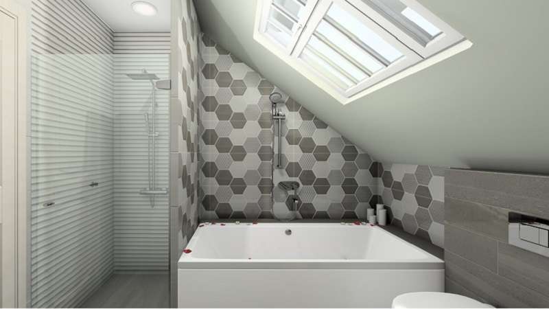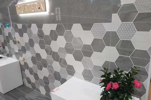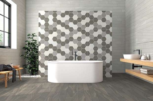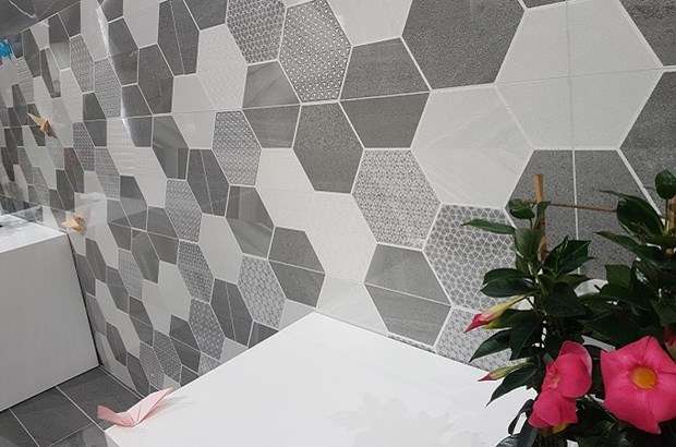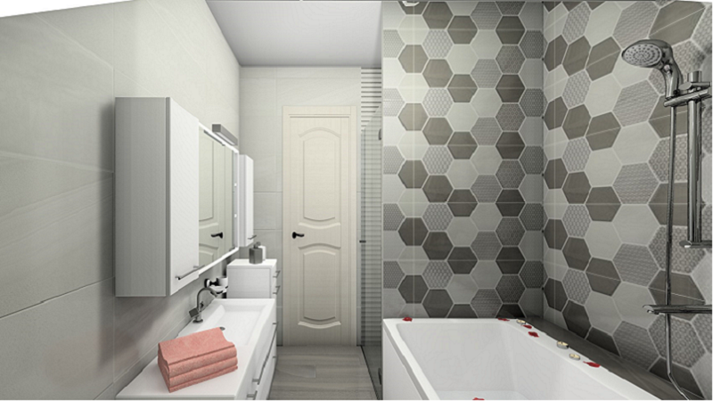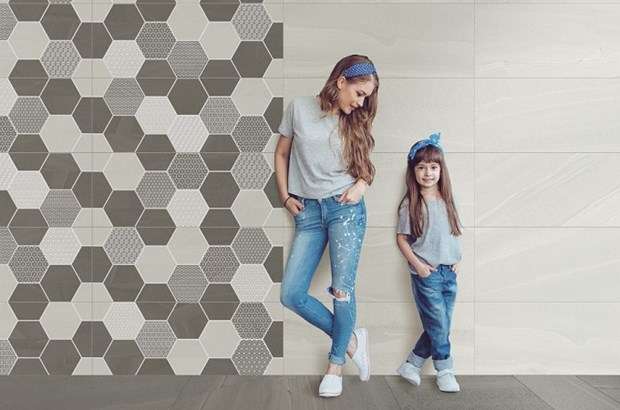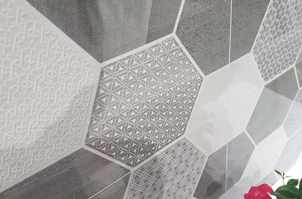 Фоновая плитка выполнена под камень и выпускается только в одном цвете White. Декоры Column с линейны рельефом представлены в двух оттенках. Роскошное панно любого размера можно получить из декора Mix-D с принтом из шестиугольников разного цвета, как однотонных, так и с мелким узором. Напольная плитка доступна в двух координированных оттенках, её формат 60х60 см.
