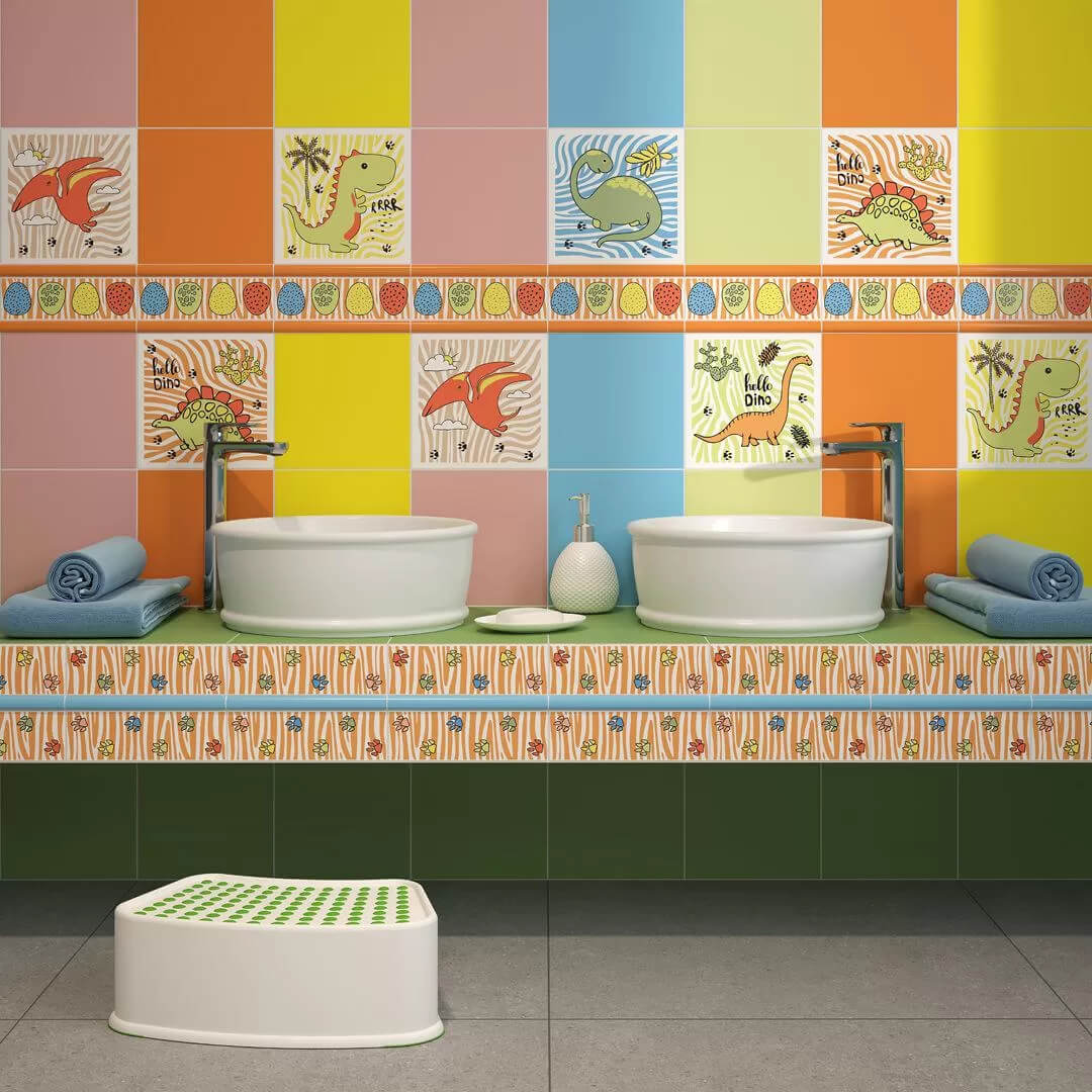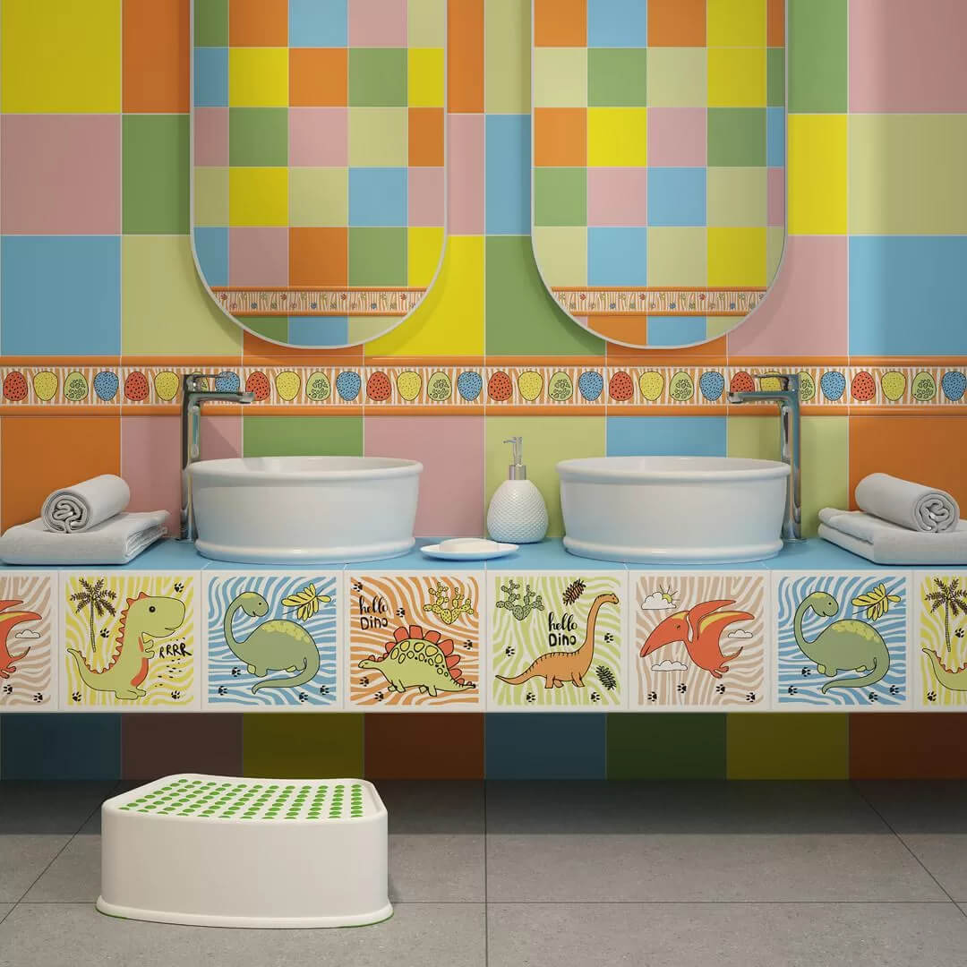 Коллекция Kerama Marazzi Динозаврики может применяться для ванной. Воплотить дизайнерские решения из цветов многоцветный и из матовая поверхности. В состав коллекции входят элементы в колличестве 7 шт. среди которых настенная плитка, бордюр. При производстве данной серии использовались такие материалы как, керамическая плитка. Коллекция Динозаврики в своем составе имеет следующие размеры: 20x20, 6x20.
