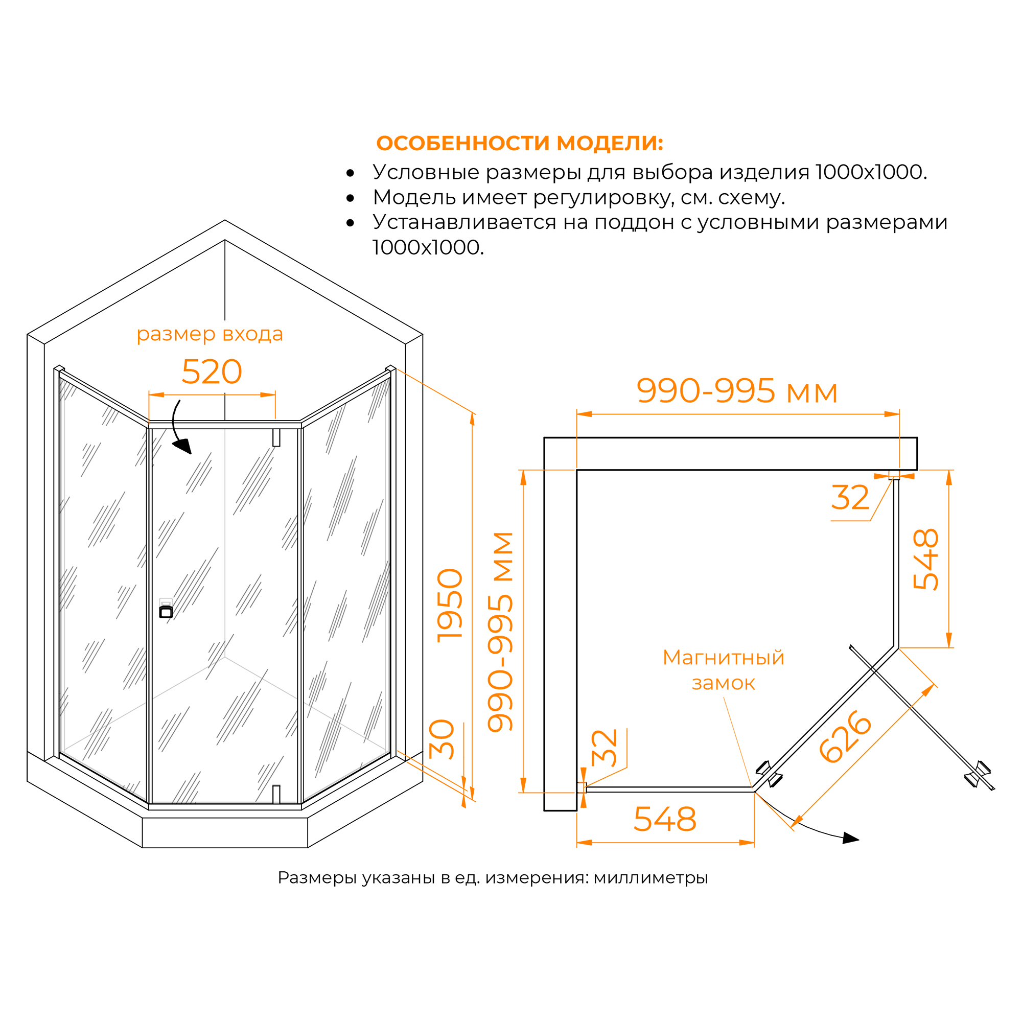 Душевая дверь RGW HO-088-G Высота общая: 1950 мм Толщина стекла: 8 мм Цвет стекла: прозрачное, матовый-сатинат Форма: Прямоугольный Цвет профиля: Хром, чёрный, белый, золото-браш Профиль: Усиленный из нержавеющей стали Класс защиты герметичности: 1 класс герметичности Конструкция дверей: Распашная Магнитный замок двери: да Покрытие стекла анти капля (для лёгкой очистки): Easy Clean Регулируемый профиль: да Ручка и усиленные петли: нержавеющая сталь Универсальная установка: да Ресурс эксплуатации: 25 лет Гарантия: 3 года Комплектуется: кристально-хрустальной богемной двухсторонней ручкой — кноп в огранке "принцесса". Разработана эксклюзивно дизайнерами компании RGW, придаёт особую изысканность и добавляет роскошь в любой интерьер. Размер 52х39 мм.