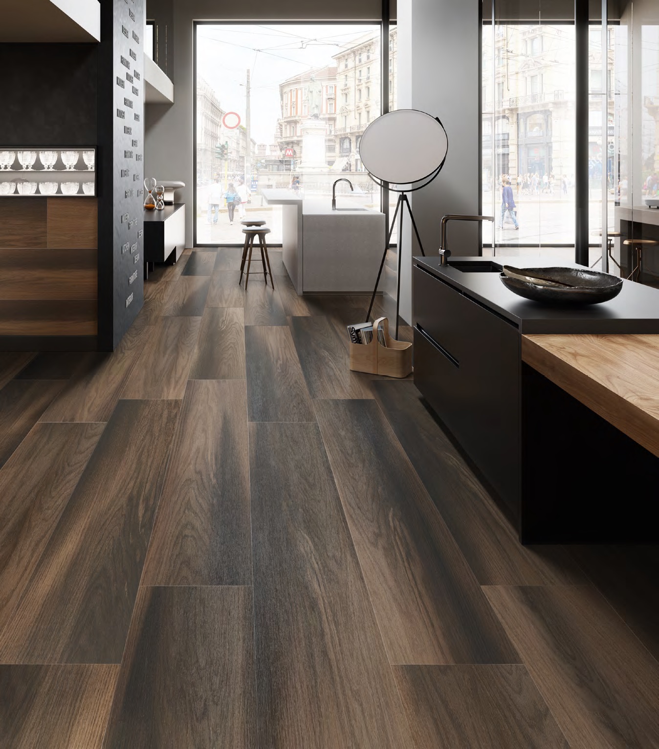 В крупном формате керамического гранита запечатлён один из самых удивительных видов древесины — так называемое «окаменелое дерево». Стволы дуба, сотни лет пролежавшие под слоем речного или озёрного грунта — редкость даже для дорогих интерьеров. Под воздействием времени, воды и земли массив приобретает интенсивную коричнево-чёрную окраску и выраженную волокнистую структуру.