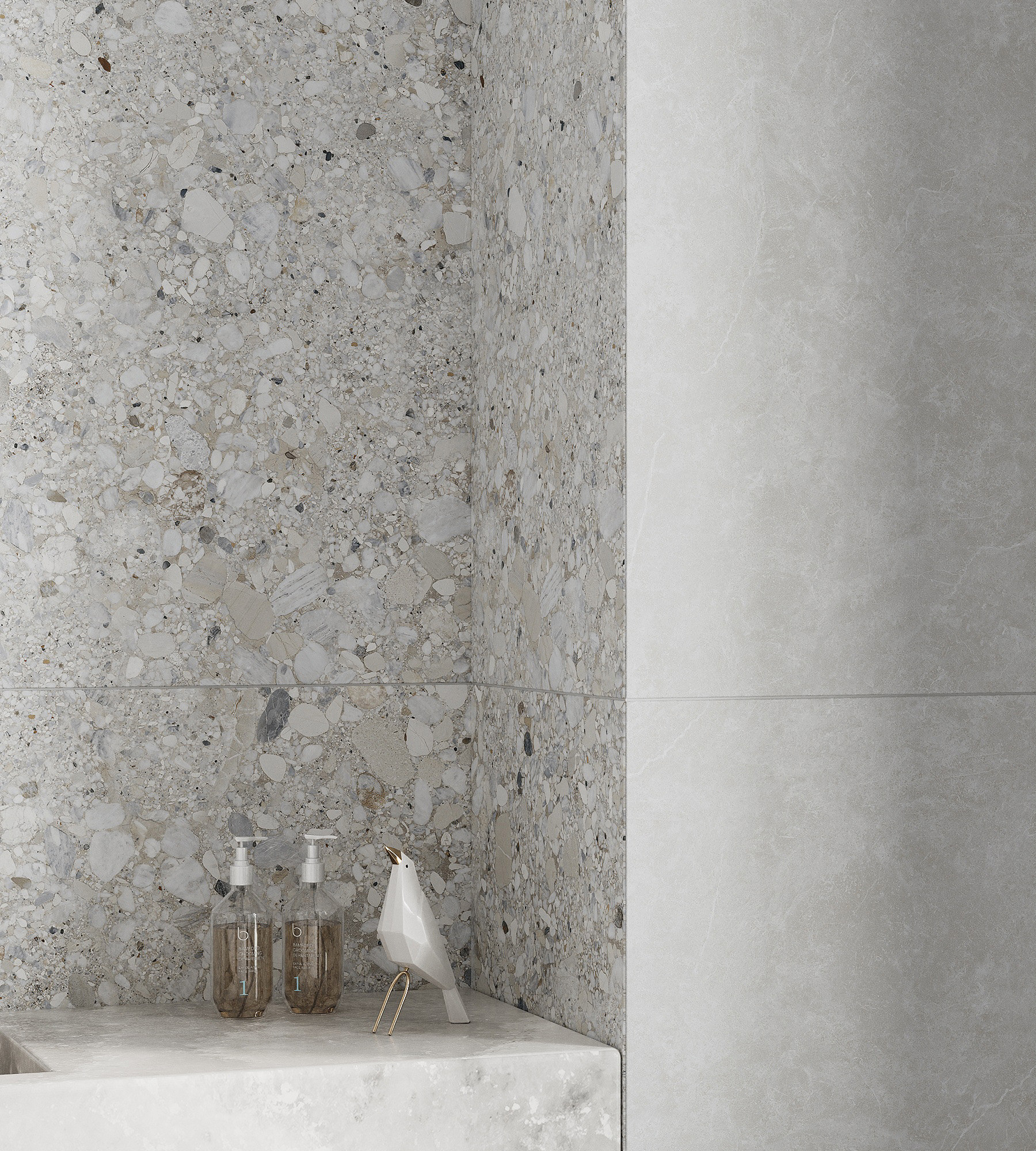 GLIATO – это керамогранит, который мастерски передает очарование традиционного венецианского терраццо, сохраняя при этом все преимущества современного материала. Его поверхность, украшенная изящными каменными вкраплениями в мягкой серой гамме, словно создана вручную, наполняя интерьер духом старинных итальянских вилл.