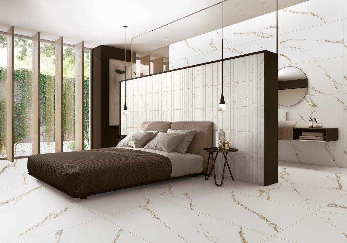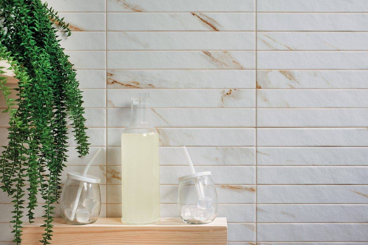 La Platera Golden предлагает изящное решение для оформления стен: небольшая плитка 35х35 см визуально разделена на продольные кирпичики с красивой фактурой мрамора и золотыми прожилками. Дизайнерам удалось передать богатство деталей рисунка, глубину и естественность прожилок, и перламутровый белый оттенок.