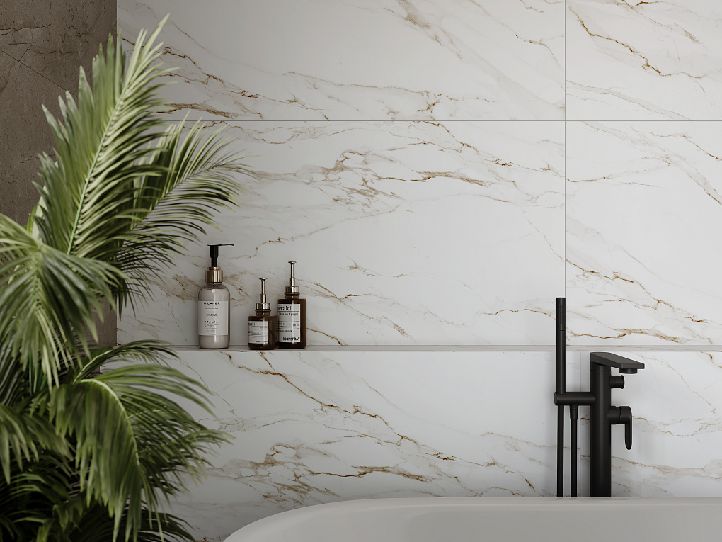 Текстура Golden – воплощение знаменитого мрамора Calacatta Oro, известного своими уникальными золотистыми прожилками, способными наполнить интерьер теплом и светом, создавая гармоничное и стильное пространство.