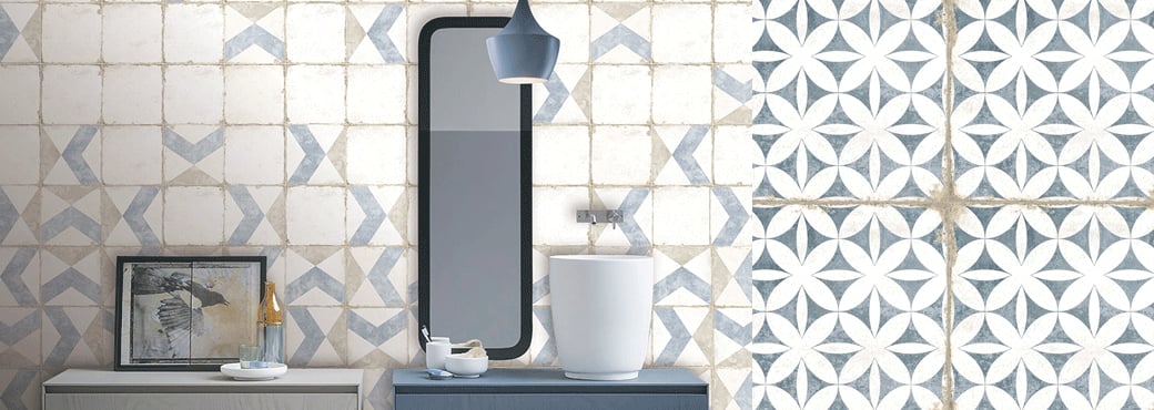 Вдохновляясь традиционной цементной плиткой, компания Nanda Tiles представила коллекцию Grafton в синих и бежевых оттенках. Цветочный узор и мягкие тона создают лёгкую атмосферу. Поверхность намеренно состарена, чтобы придать этим плитам из керамогранита аутентичный вид.