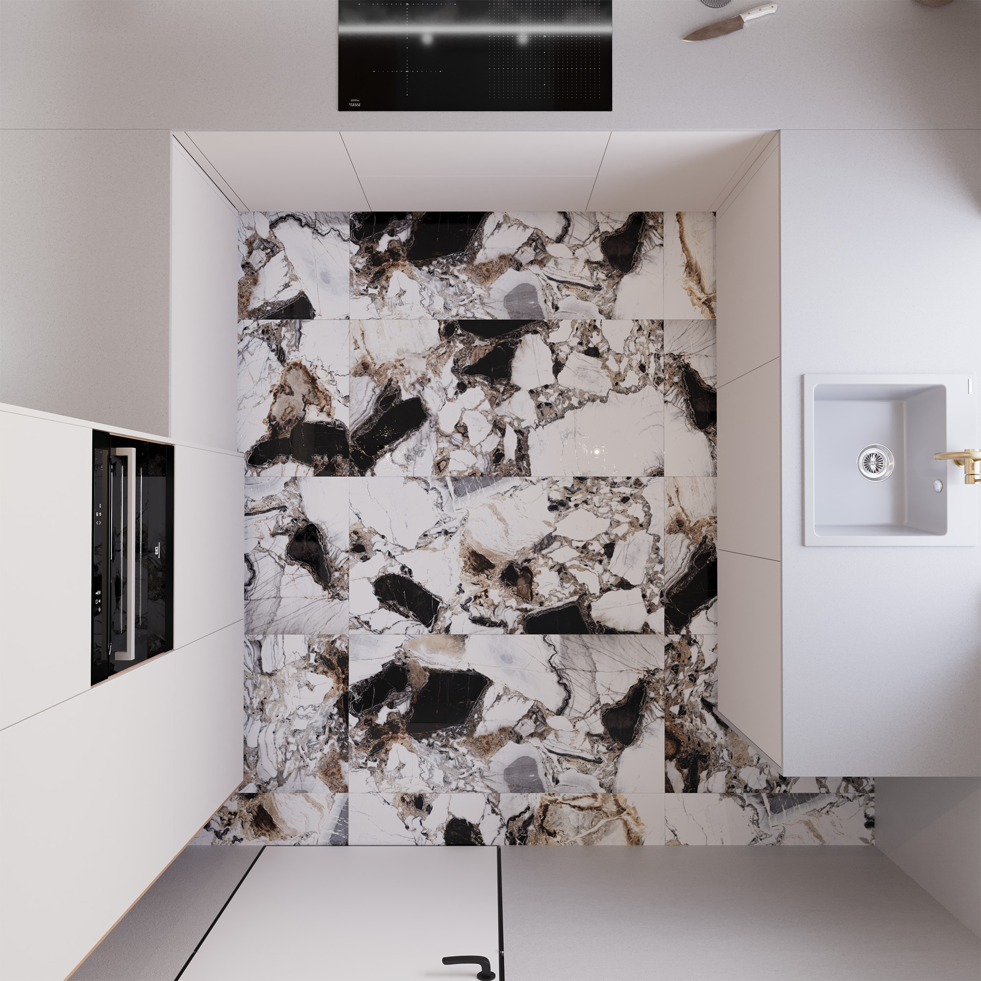 GRANDE CRYSTAL — керамогранит белого цвета, который великолепно комбинируется с чёрным и золотым камнем, создавая эффект величественного слияния горных пород. Это удивительное сочетание цветов наполняет пространство светом и грацией, формируя уникальную атмосферу уюта и элегантности. Золотистые линии, изящно переплетающиеся в мраморе, подчеркивают глубину черного и серого фона, создавая захватывающий визуальный эффект, который привлекает внимание с первого взгляда.