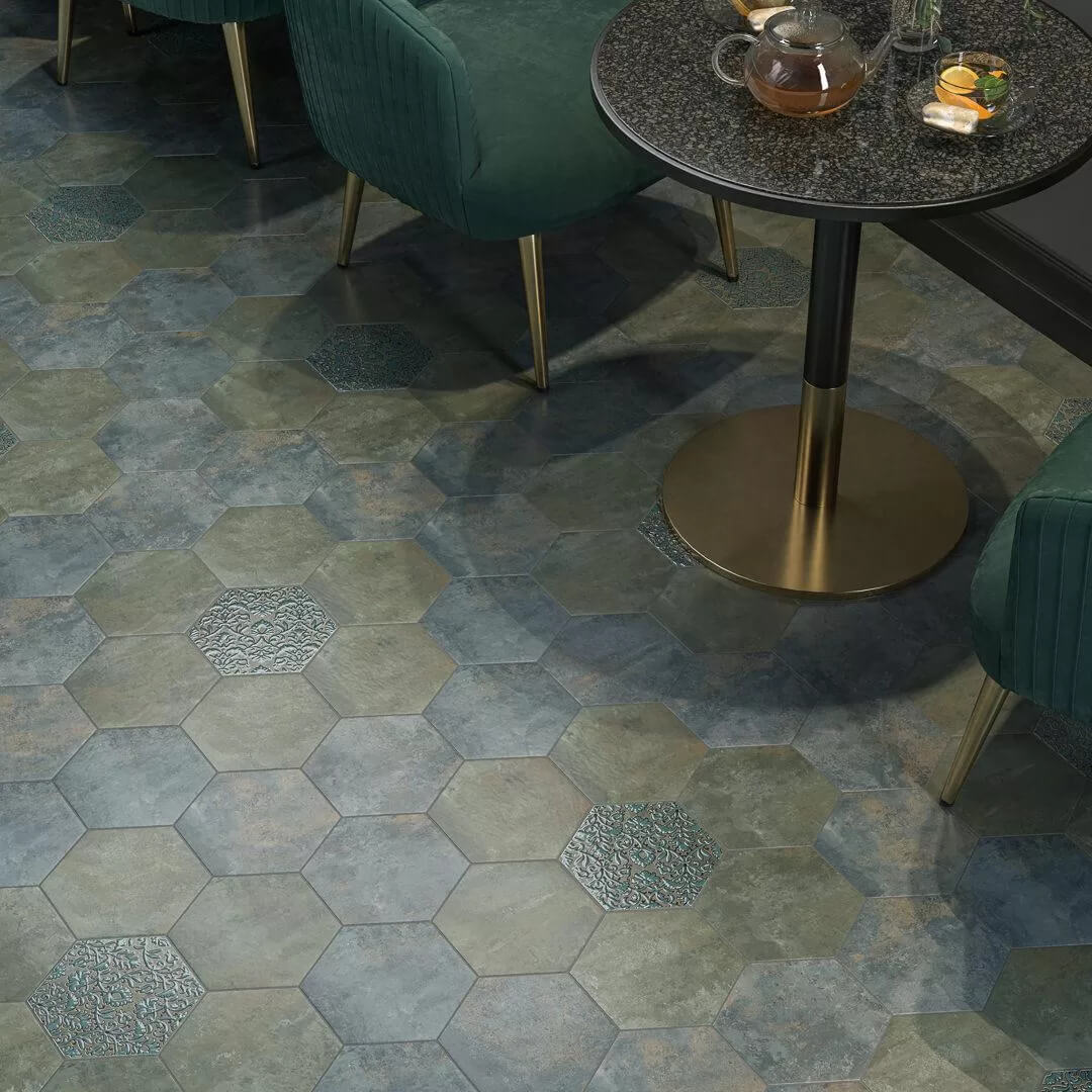 Коллекция керамического гранита Гроссето от производителя KERAMA MARAZZI украсит любой интерьер и сделает его уникальным и неповторимым. Шестиугольные плиты с неравномерным матовым покрытием в варианте котто выполнены в размере 20x23,1 см. Кухня, прихожая или летняя веранда будут выглядеть просто блестяще благодаря необычной форме отделочного покрытия и разнообразному рисунку, выполненному с применением современных цифровых технологий. Яркие и насыщенные узоры будут прекрасно сочетаться с одноцветными элементами. Дизайнеры подготовили декоры в четырех идентичных фону оттенках с геометрическим и растительным орнаментом. Используемые реактивные материалы меняют свой оттенок в зависимости от освещения.