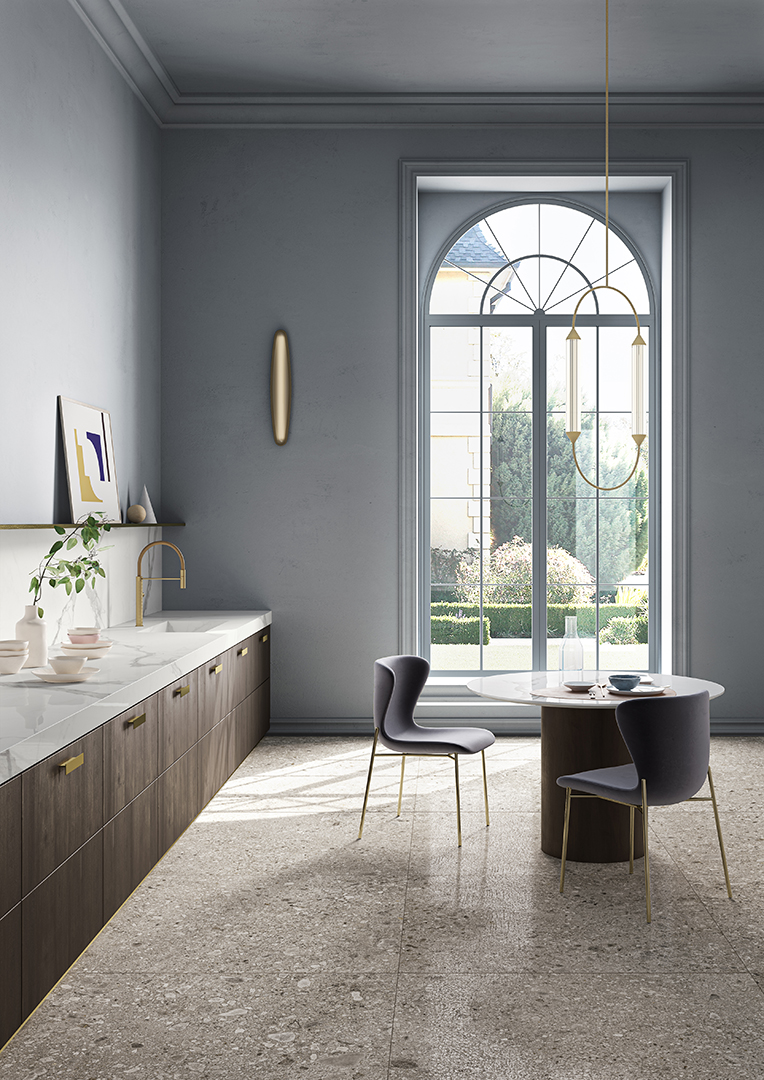 Коллекция утолщенного керамогранита Del Conca Stelvio выполнена в трех цветах, в формате 60x90. Это матовая продукция итальянского бренда, нацеленная на наружные работы. Прежде всего отделочный материал такого типа гармоничен для укладывания дорожек и отдельных зон на открытом воздухе. Он долговечен и неприхотлив в повседневном уходе. Стилистически серия адресует к тематике натурального камня, графика имитирует породу месторождения Cepoo Di Gre.