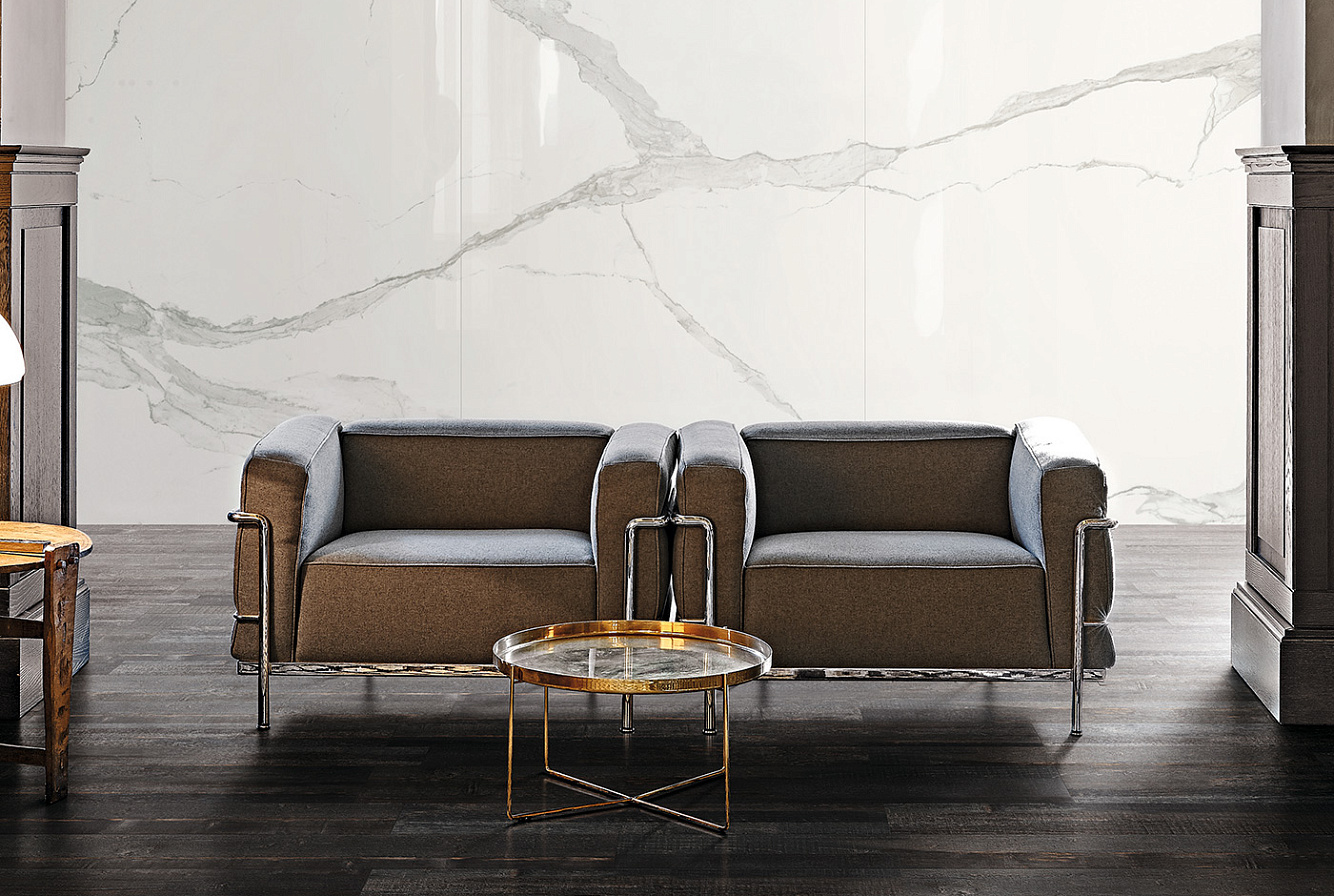 Подборка стилей пятидесятых годов приобретает изысканную современность благодаря переплетению материй и подчеркиванию контрастов. Индивидуальность находит себе место среди самых гламурных материалов из предлагаемых природой. В результате исследований, проведенных лабораторией стиля Rex, увидела свет коллекция из 5 сортов мрамора и 3 пород дерева, которые борются за главенство в одном интерьере.