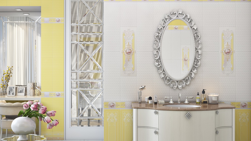 Облицовочная керамика представлена белой, сиреневой и желтой плитой с тонким замысловатым узором по фону. Желтый и сиреневый декоры имитируют филенчатые панели, обрамленные классическими растительными виньетками.