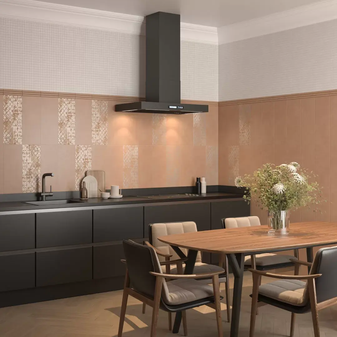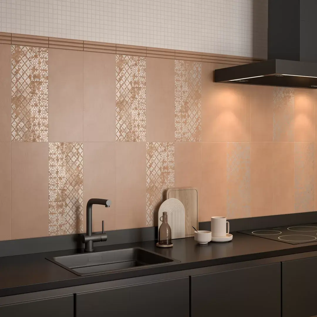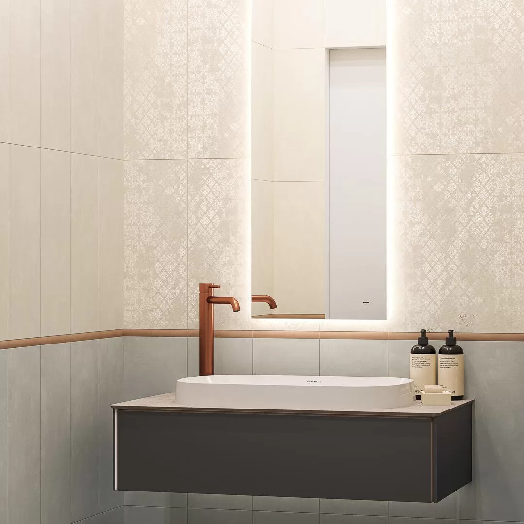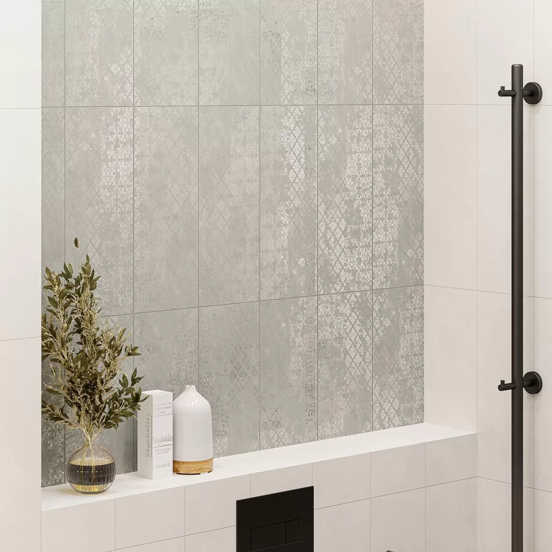 На декоративной плитке 20×50 воспроизведена благородная старина, характерная для Венеции. На бетонную основу словно наброшено тонкое кружево — ещё один очень венецианский мотив. Декоры выполнены с применением металлизированной краски, отчётливо проступающей на свету.