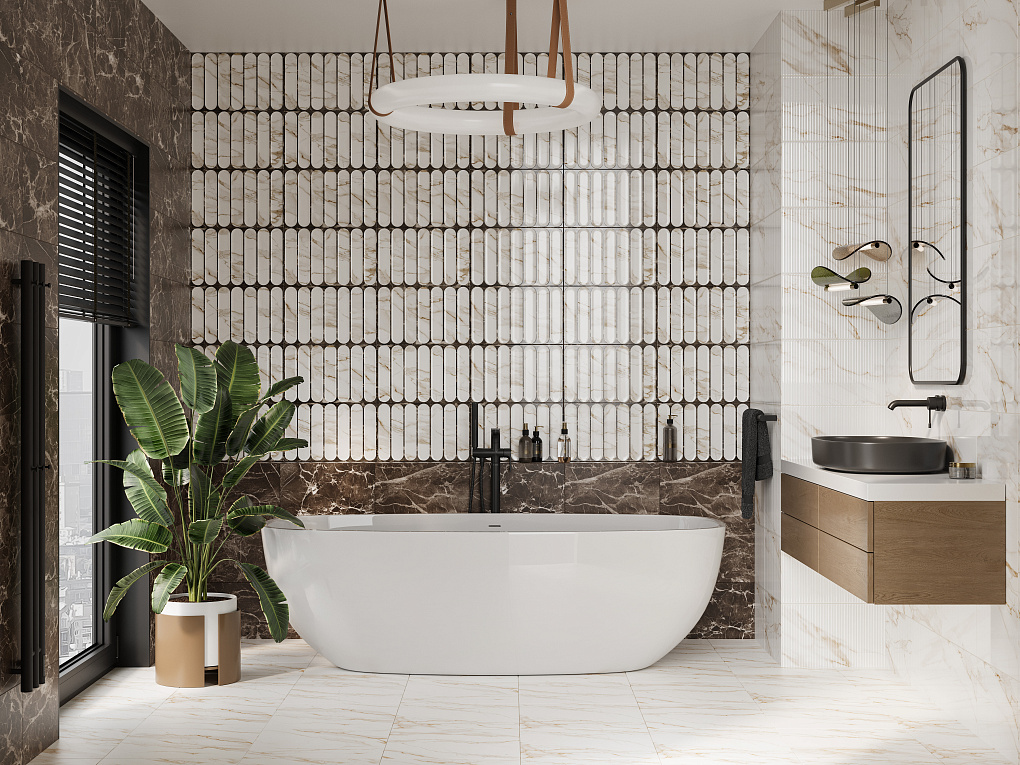 Коллекция «Капелла» представляет собой элегантное сочетание переосмысленных и осовремененных классических линий античных каннелюр, которые образуют два рельефа этой стильной коллекции. На декоративной плите великолепно сочетаются два вида мрамора из базовых плит: белый мрамор с коричневыми прожилками и коричневый имперадор с бежевыми прожилками. Благодаря контрастному сочетанию этих мраморов на рельефе, создается впечатление, что темный вычерпали, оголив белый, а глянцевая глазурь наполняет поверхность бликами и усиливает игру света, делая рельеф более выразительным. «Капелла» способна преобразить любое пространство, придать ему утонченности и подчеркнуть красоту каждой детали интерьера.