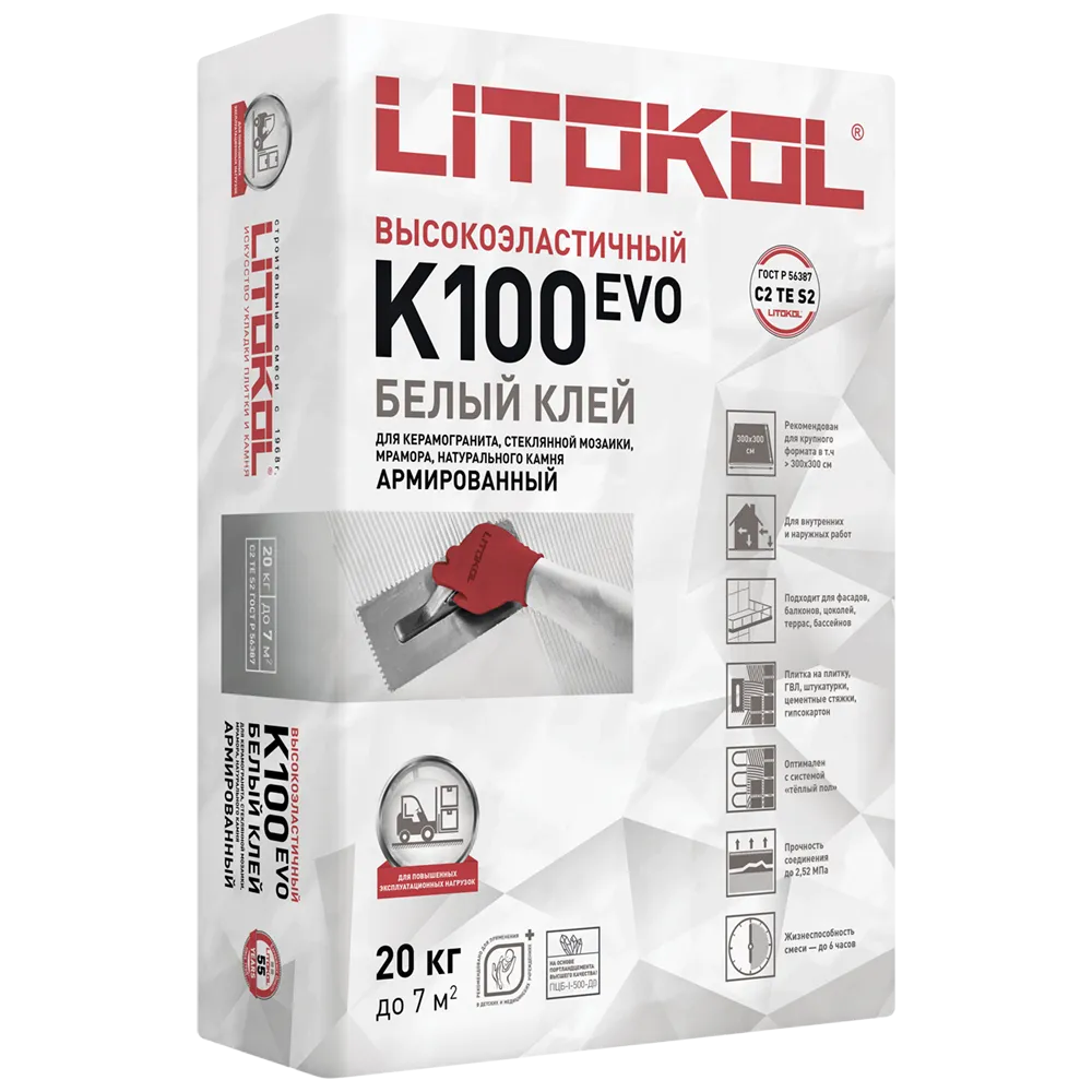 Клей белый фиброармированный высокоэластичный тиксотропный для керамической плитки, керамогранита и камня более 300х300 см. Класс С2 TE S2 по ГОСТ Р 56387
