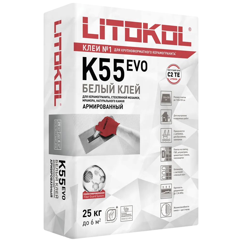 Клей белый фиброармированный тиксотропный для стеклянной мозаики, мрамора, камня, керамической плитки, керамогранита. Класс С2 ТE по ГОСТ Р 56387. Укладка стеклянной мозаики, мрамора, натурального и искусственного камня, керамической плитки и керамогранита размером до 120х90 см.