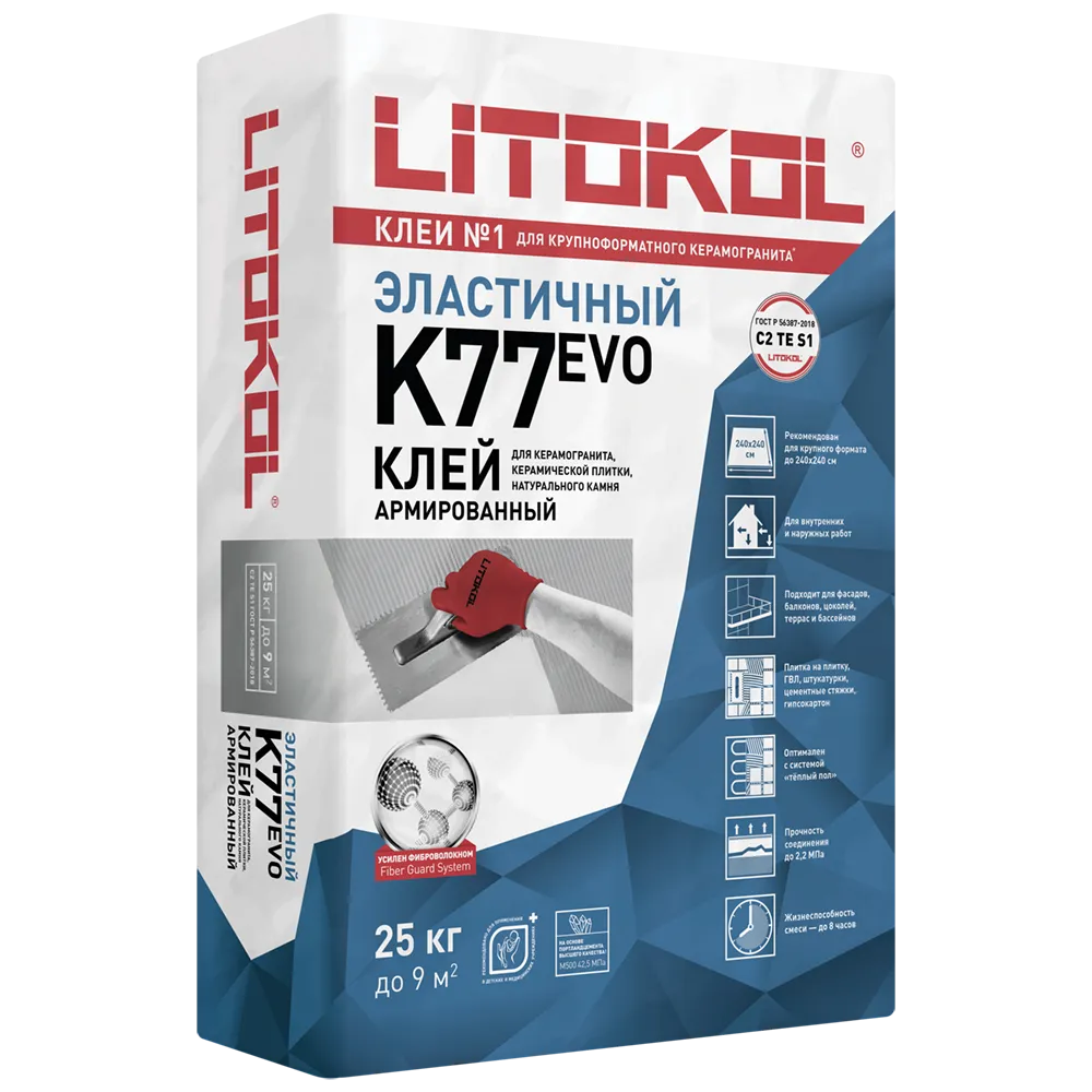 Клей фиброармированный эластичный тиксотропный для керамической плитки, керамогранита и камня. Класс С2 TE S1 по ГОСТ Р 56387. Укладка натурального и искусственного камня, керамической плитки и керамогранита в том числе крупного формата размером до 240х240 см.