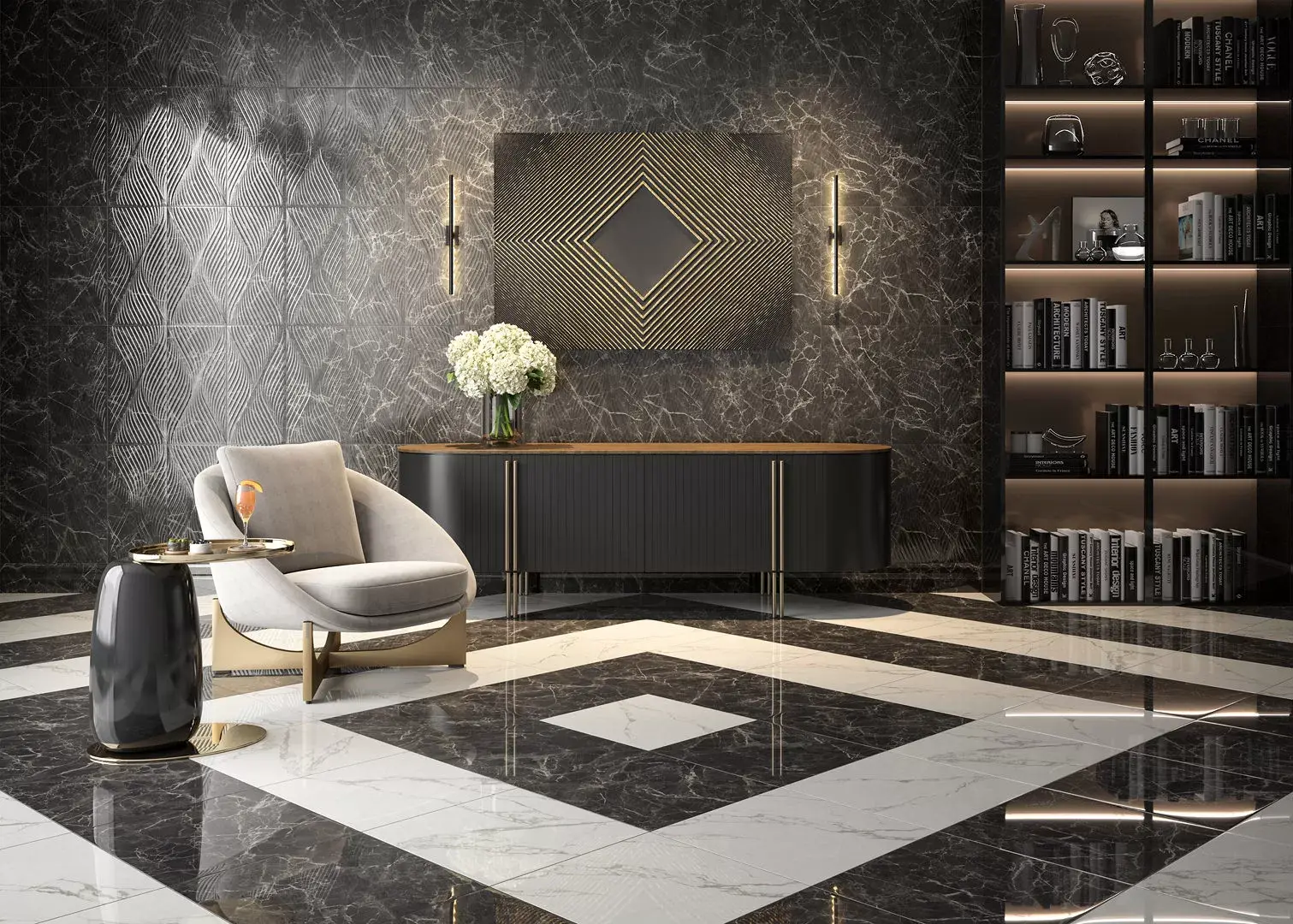 Контраст чёрного и белого мрамора — беспроигрышный вариант для создания обстановки. Ещё одно оригинальное декоративное решение, впервые предложенное в этой серии, — своеобразный «дуэт» плитки с отверстием и совпадающих с ним круглых элементов для включения в композицию собственных наборных декоров.