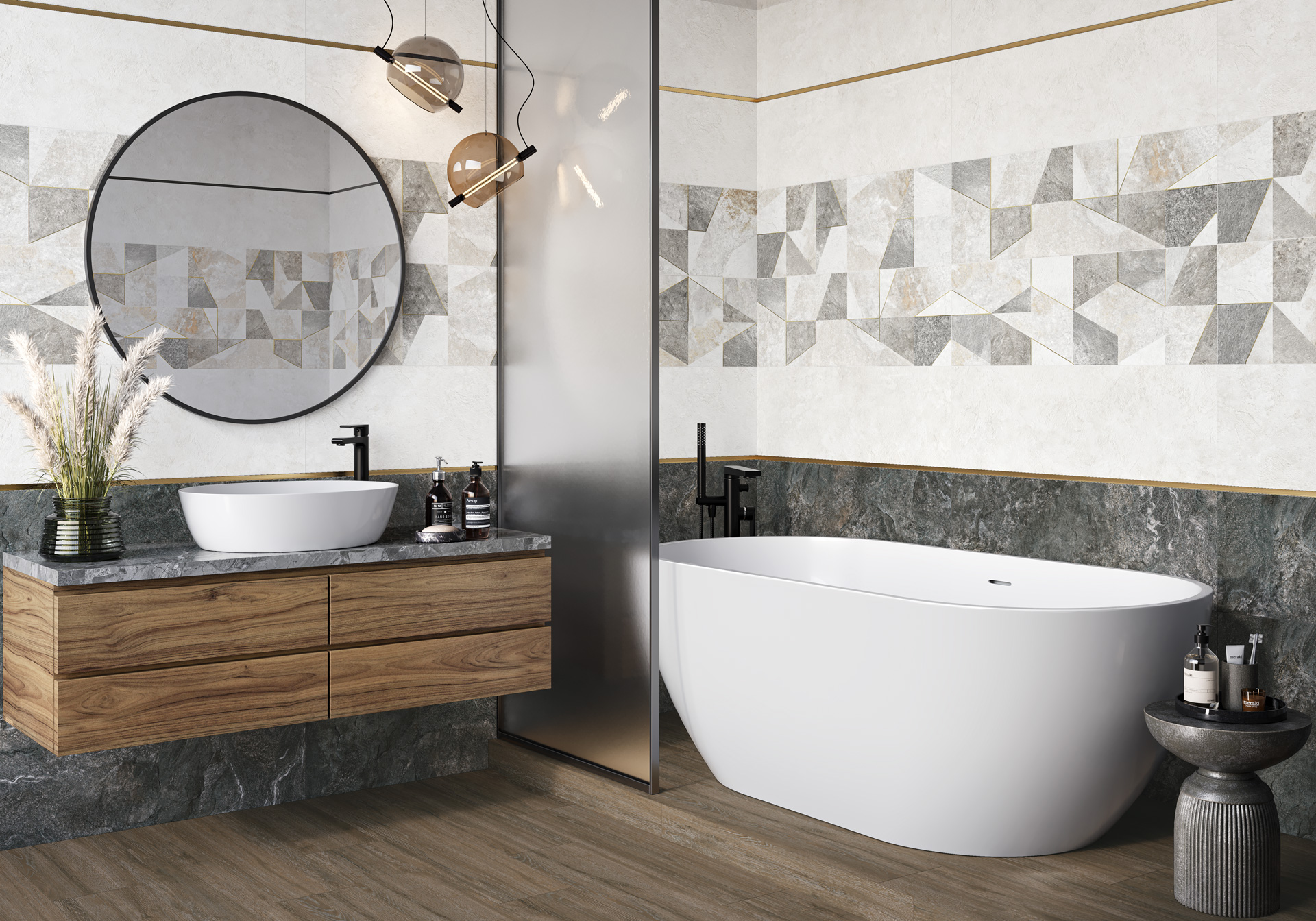 Матовая коллекция настенной плитки Land в формате 300x900 мм. Представляет собой сочетание текстуры камня кварцита и бетона. Приятный оттенок светлой базовой плитки гармонично сочетается с многоцветной темной базой. Все это соединяется в декоративных массивах, в двух цветовых вариантах с геометричным рисунком. Все плитки коллекции произведены на рельефе. В зависимости от стиля и дизайна общего пространства есть выбор комбинирования плиток между собой, чтобы создать интерьер под свой запрос. Оригинальным решением будет оформление лофт-пространств или брутальных интерьеров. Плитка имеет ректифицированный край, он является дополнительным преимуществом, позволяющим осуществить укладку с минимальным швом. В состав коллекции входит золотой бордюр и напольный компаньон в виде керамогранита с текстурой кварцита в формате 600x600 мм, также предлагается керамогранит с текстурой дерева в формате 200x900 мм.
