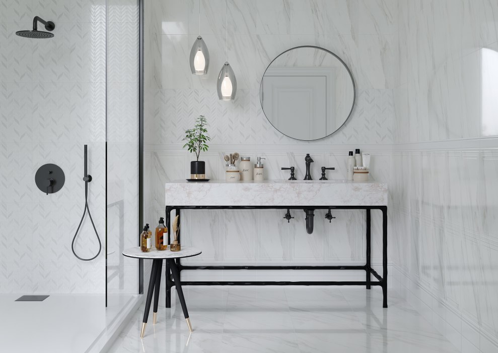Total white — это совершенная классика, которая впишется в любое стилевое решение. Сияющий белый стал базовым цветом в коллекции "Леона", а оттеняет его благородный серый мраморных прожилок. Декоративные плиты украшены сочетанием геометрического и растительного орнамента, причем обрамление листьев материалом, создающим микрорельеф, придает поверхности глубину и интересную игру бликов. Рельеф "буазери" на мраморных вставках, плинтус и бордюр позволяют легко формировать вертикальную выкладку и могут стать визуальными акцентами в интерьере.