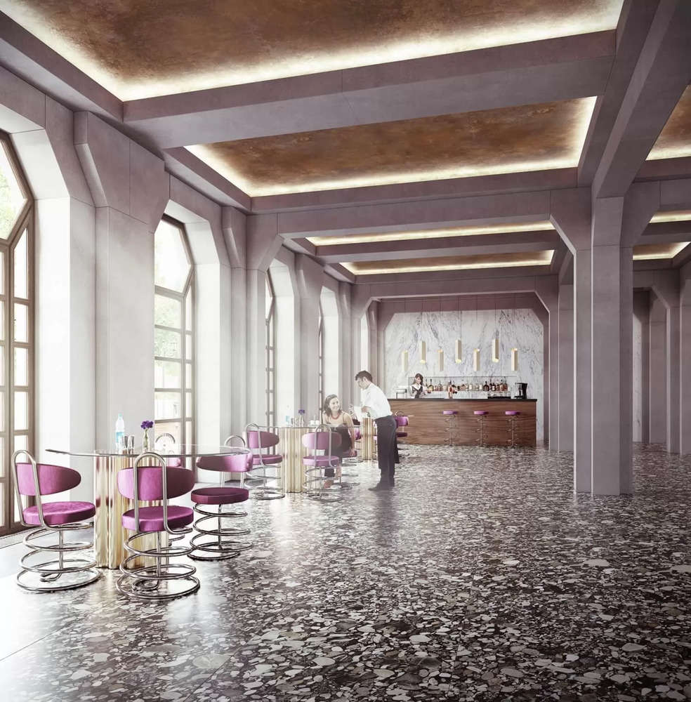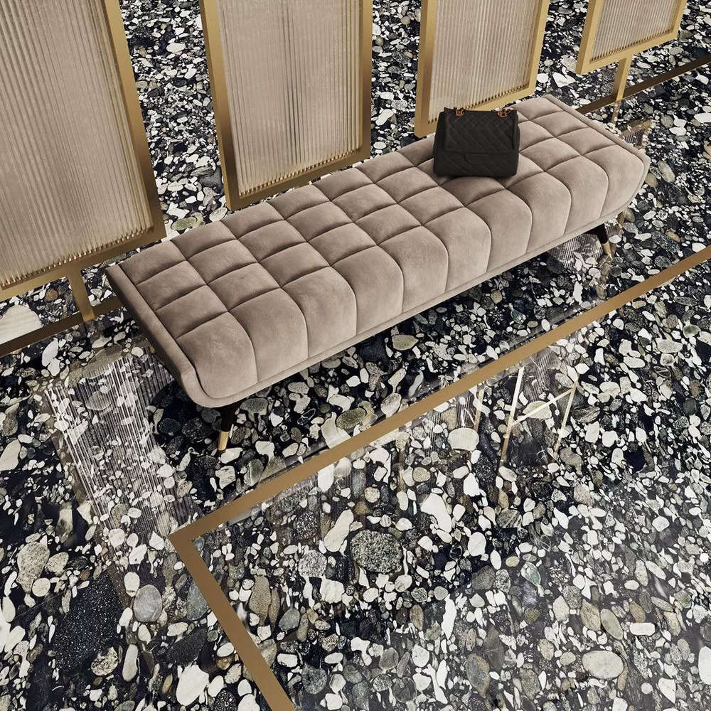 Керамический гранит передаёт выразительную текстуру камня со светлыми и темными вкраплениями.