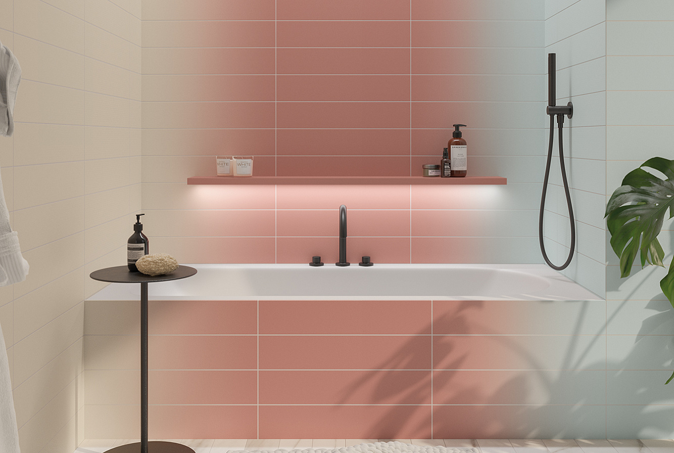 Эффектная цветовая палитра MELANGE состоит из 15 выверенных оттенков: от легких светлых, через идеальные динамичные градиенты, до умеренно насыщенных моноколоров. При ближайшем рассмотрении, на поверхности плитки заметна невесомая линейная структура, придуманная чтобы максимально нивелировать возможные шероховатости в сочетании оттенков. Серия доступна в едином среднем формате 10,7x54,2 см с матовой отделкой поверхности. Такой размер будет удобен для создания выразительных и уникальных проектов разного масштаба — от небольших ванных комнат до общественных пространств.