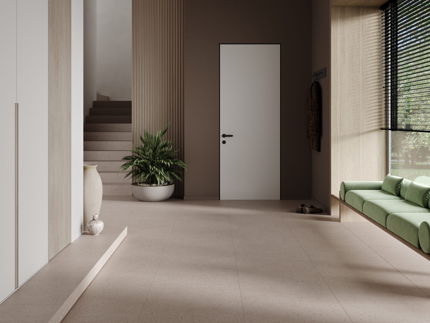 Не выходящий из моды терраццо переосмыслен в коллекции Modis. На сером бетоне эффектные контрастные вкрапления черного и белого цвета смотрятся деликатно и естественно. Тёмные камушки украшены карвингом для придания рисунку глубины и блеска. Терраццо используют в интерьерах для придания им лёгкости и воздушности. Материал с таким дизайном становится изюминкой любого минималистичного пространства, украшая его и дополняя дизайнерскую идею.