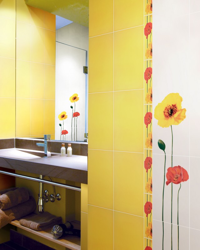 Яркие сочные цвета оживут на полах и стенах вашей ванной комнаты с керамической плиткой от украинского производителя Atem Mono. Вся прелесть данных образцов в удивительном сочетании насыщенных оттенков огненно-красного, нежно-голубого и солнечно-желтого со скромным белым. Эти великолепные цвета сочетаются также на декоративных элементах в виде вертикальных панно, шикарных декоров и горизонтальных фризов. Они особенны своими удивительными изображениями ярких маков, а также морских обитателей – веселых, подвижных рыбок. При первом взгляде на эти великолепные рисунки, складывается впечатления, что они оживают прямо на глазах, так как рисунки мастерски нанесены на поверхность плитки.