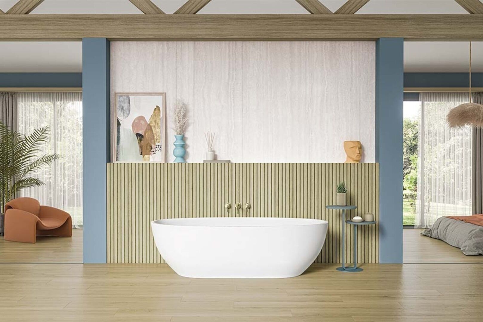 Цветовая гамма коллекций выполнена в теплых, натуральных оттенках. Для коллекции имеется готовое решение от фабрики Azulev: настенные панели из белой глины - Wupp в формате 60x120. Деревянные панели дополняются тонкими узкими рейками и создают современный интерьер в едином стиле.