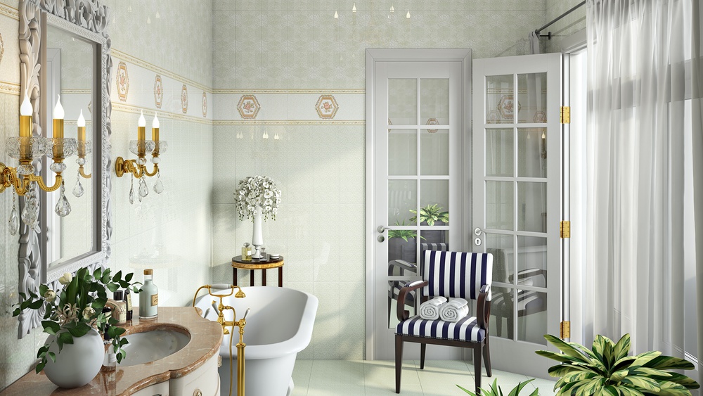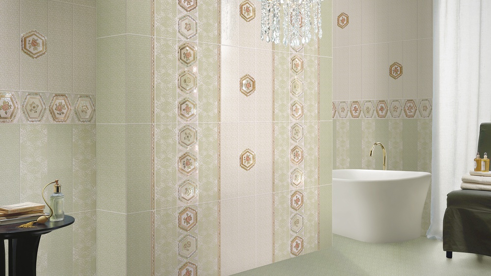 Базовая настенная плитка Нефритовый фон от Ceramique Imperiale предложена в светло-зеленом и зеленом цвете. Она имеет на себе густой орнамент из мелких листочков. Такой же принт присутствует и на декорах. Два из них по центру украшены шестиугольным медальоном с изображением цветка шиповника, а еще два декора обладают уже тремя такими медальонами.