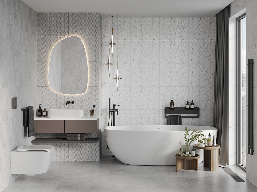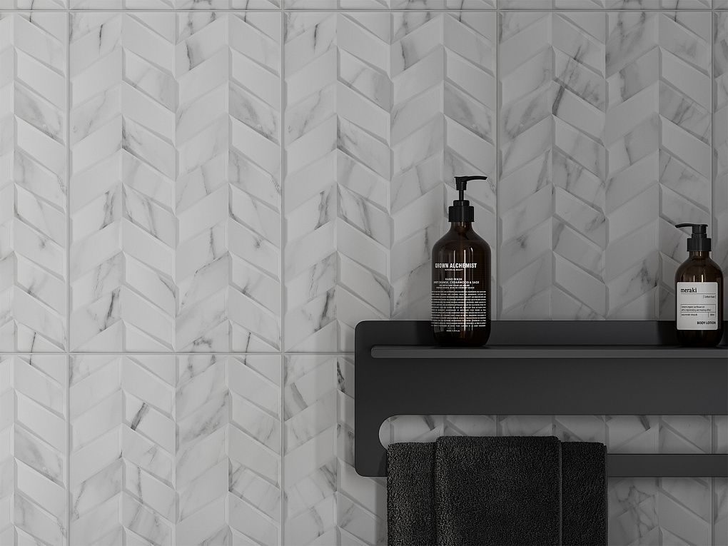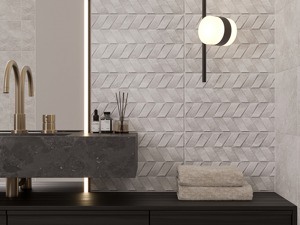 Новое и свежее сочетание натуральных текстур белого мрамора и серого камня нашли отражение в коллекции «Нова». Акцентными элементами коллекции являются рельефные плиты с шевронным расположением деталей, ограненных под различными углами. Такой рельеф создает игру света и тени на поверхности, делая интерьер интересным и динамичным. Благодаря универсальному сочетанию плит в коллекции «Нова», можно преобразить любое помещение, добавив в него строгости и индивидуальности.