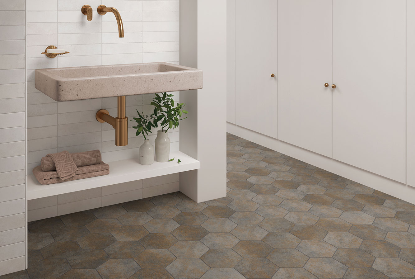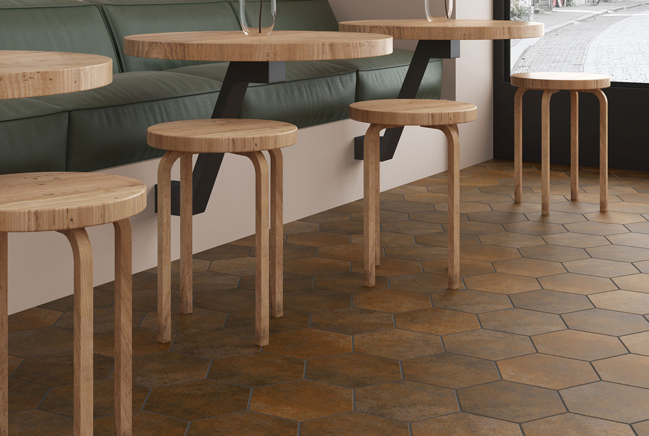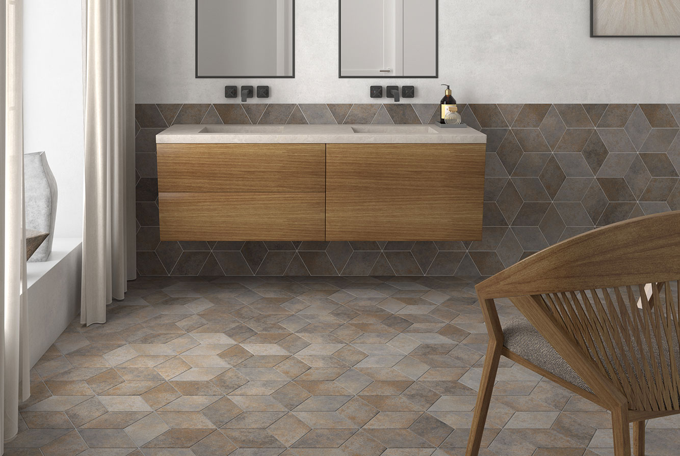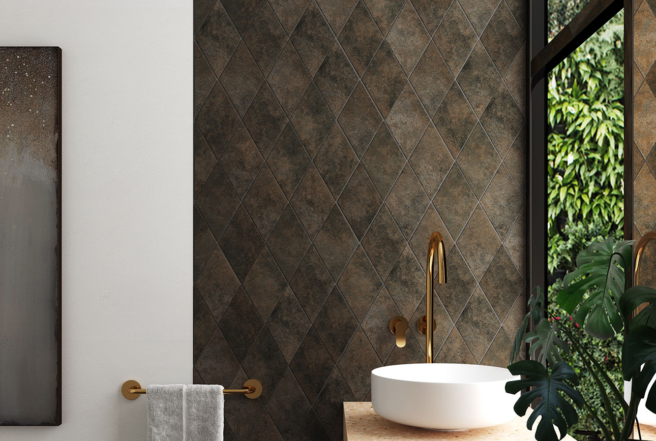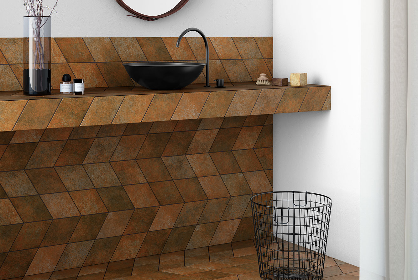 Коллекция EQUIPE OXIDE / ЭКИПЕ ОКСИД — новая серия универсального керамогранита, эффектно имитирующая патинированный металл. Производится в двух форматах — шестиугольном 17,5х20 см и в виде ромбов 14х24 см.
