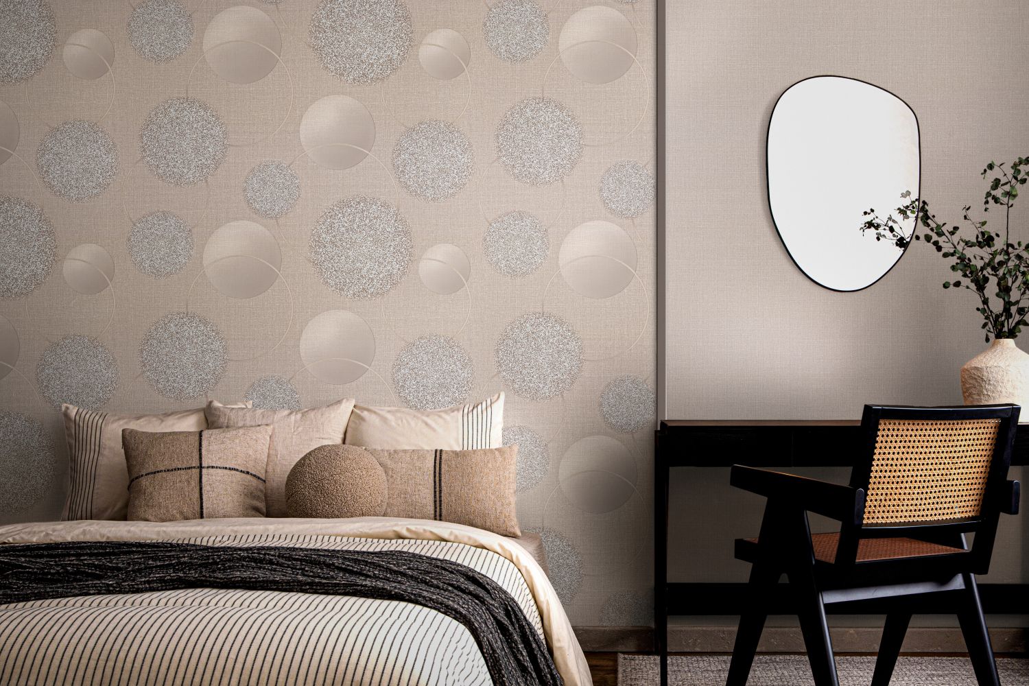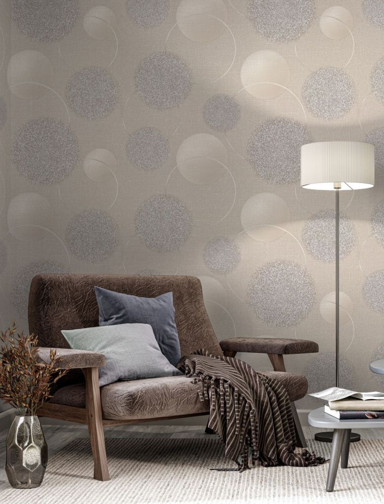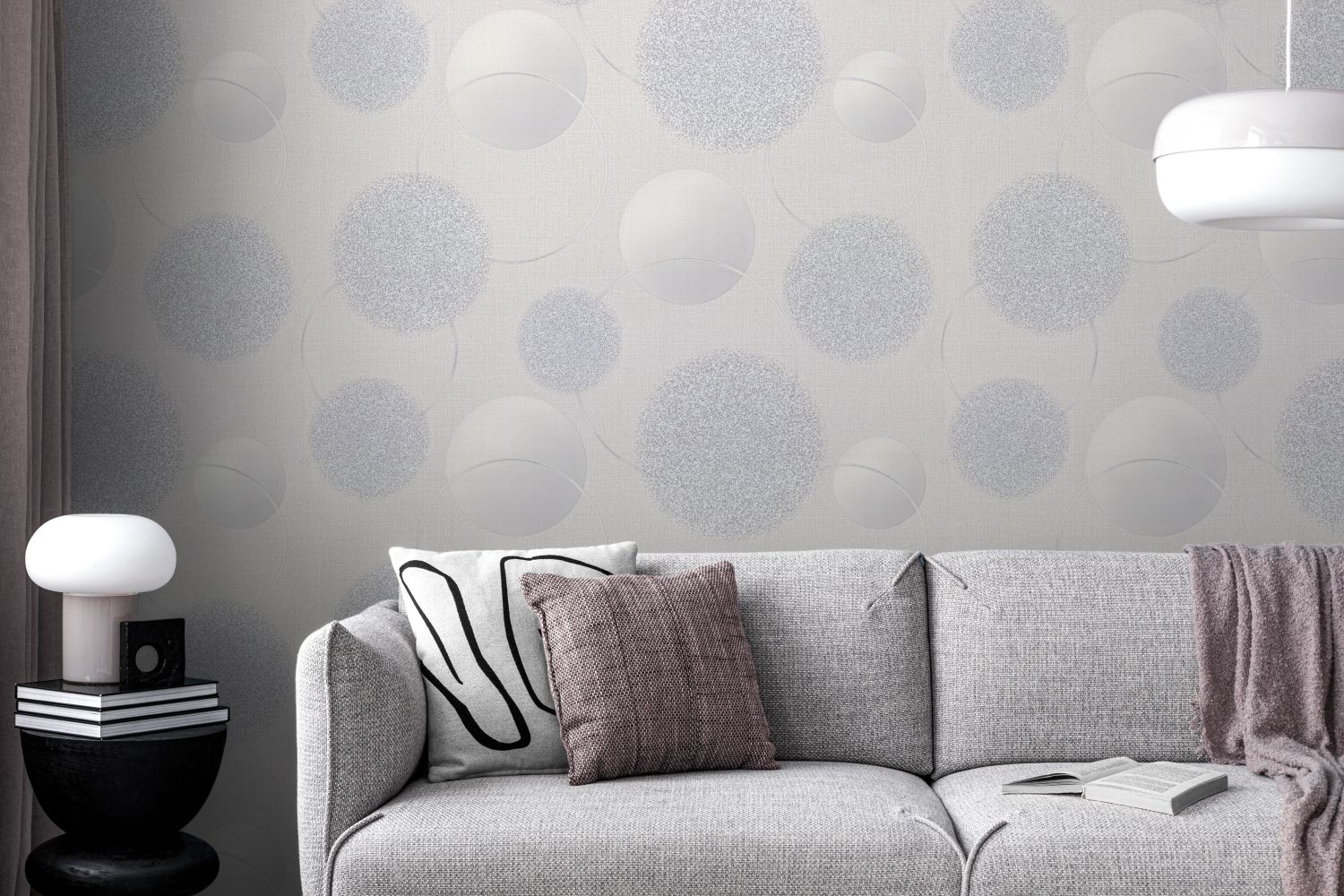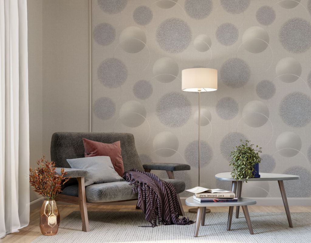 Нежные пушистые шары на обоях Oliver 2 напоминают плывущие по небу облака или планеты, тающие в туманной дымке полутонов. Рисунок обоев многоплановый, он кажется просторным и будто парит в воздухе.