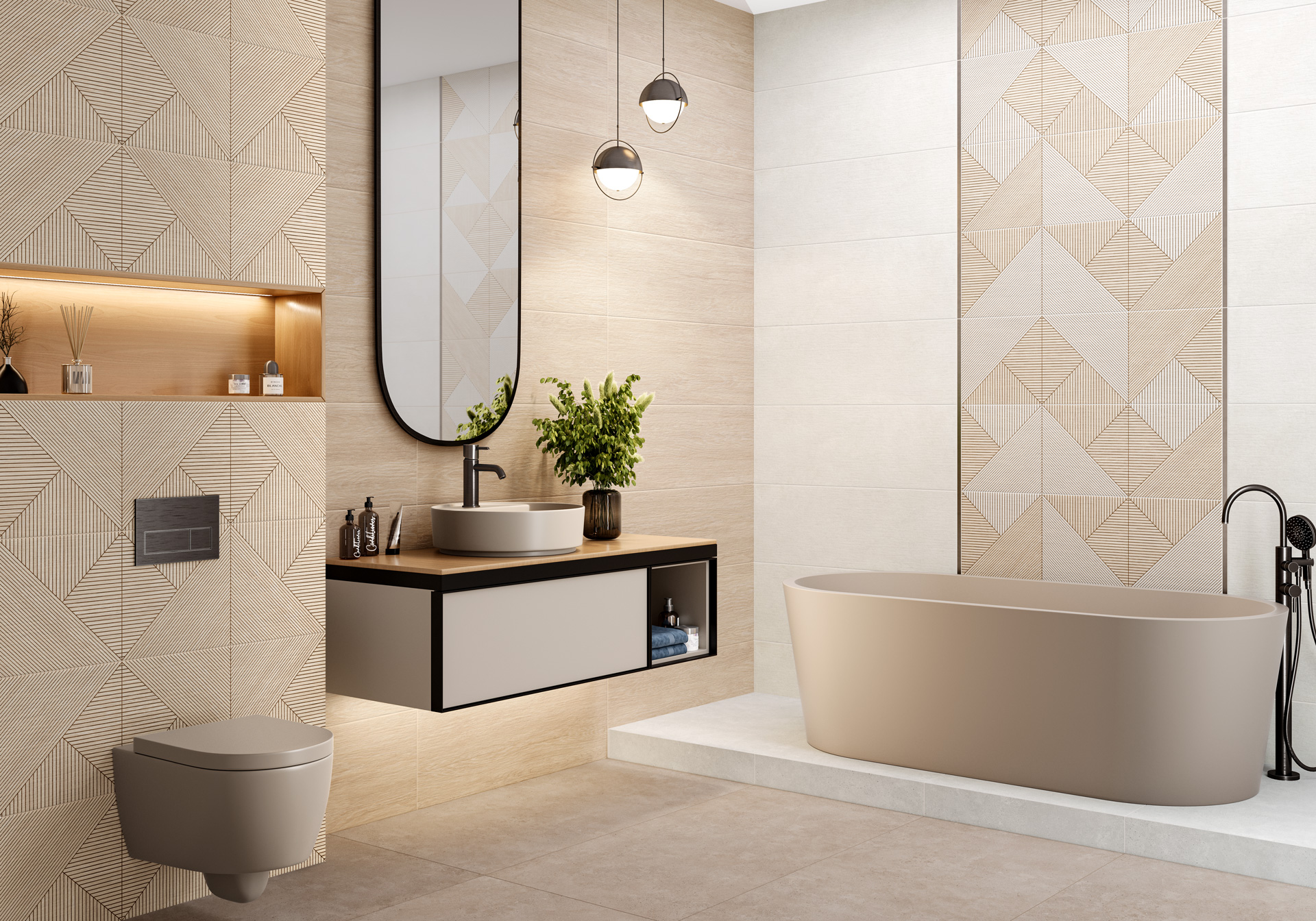 Оригинальная коллекция настенной плитки Patio произведена в формате 300x900 мм, в теплой гамме с матовой поверхностью и ректифицированным краем. Представляет собой сочетание текстуры бетона и дерева. Два оттенка дерева прекрасно сочетаются друг с другом, а декоративные массивы в двух вариантах в виде геометричных вставок с «рейками» будут интересным решением в оформлении не только ванных комнат, но и общественных пространств или гостиных в жилых зонах. Этот дизайн прекрасно впишется в такие дизайнерские стили как экостиль, бохо, джапанди. В состав коллекции входит платиновый бордюр, ректифицированный керамогранит с текстурой бетона в формате 600x600 мм. Разнообразие элементов коллекции позволит создать оригинальный интерьер.