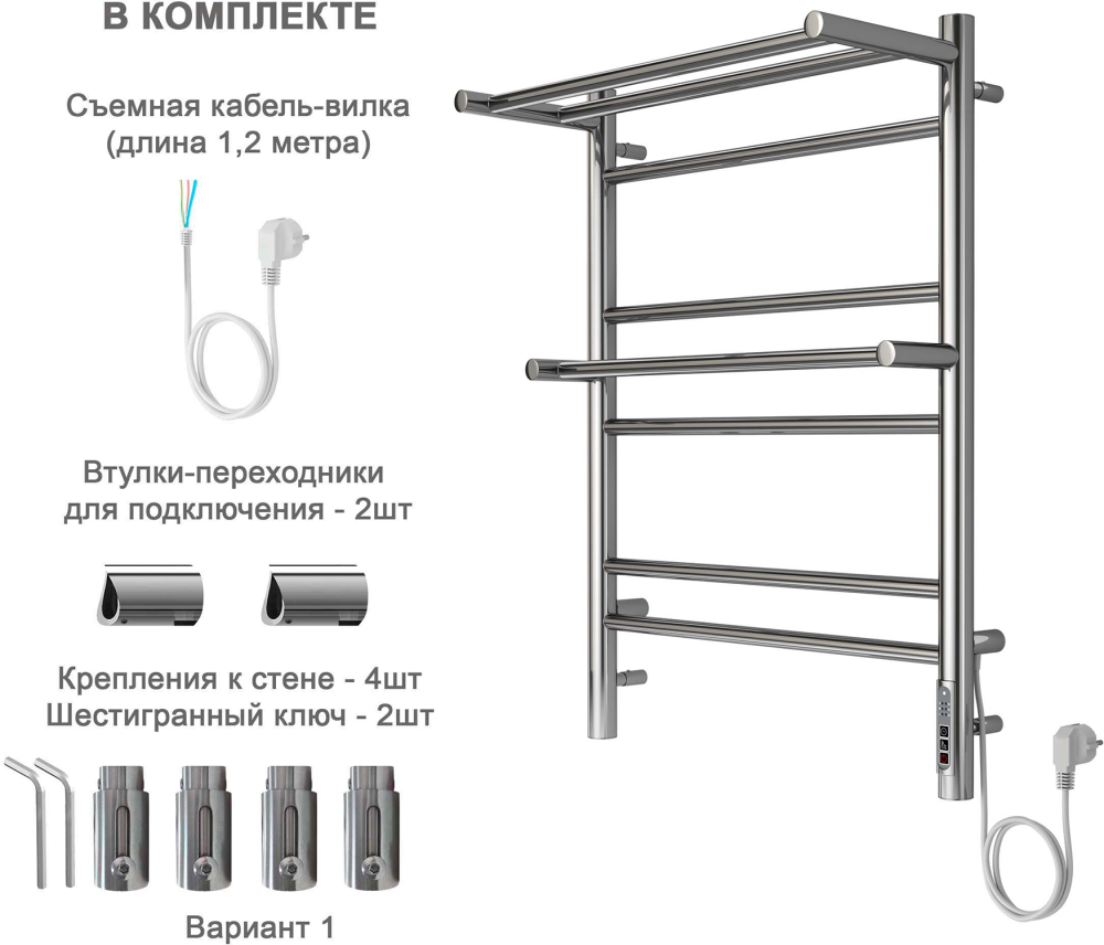 • Простота установки и полная комплектация, изделие готово к установке: все необходимое для монтажа уже в комплекте. Для монтажа не потребуется профессиональная помощь или использование сложных инструментов. Достаточно закрепить полотенцесушитель на стене в непосредственной близости от розетки. Габарит выступа от стены регулируется телескопическими крепежами.
