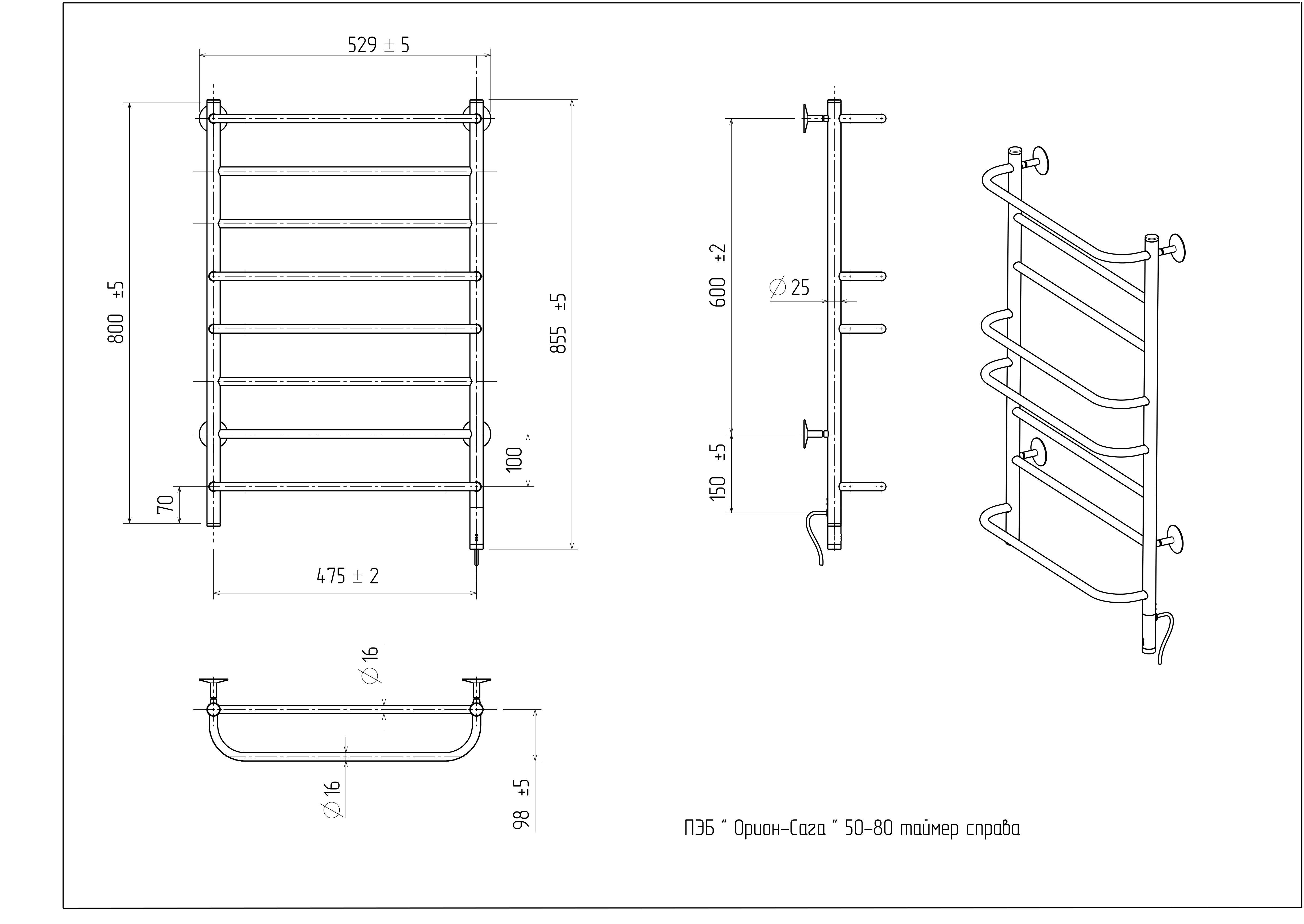 Электрический полотенцесушитель изготавливается по ТУ 3468¬001¬73870861¬2007 из высококачественной нержавеющей стали марки AISI 304, устанавливается на стене на специальных кронштейнах (входят в комплект к изделию) и подключается к источнику тока 220-240В, 50Гц. Длина шнура – 1,5м. Температура нагрева полотенцесушителя, допустимая санитарными правилами 65 С.